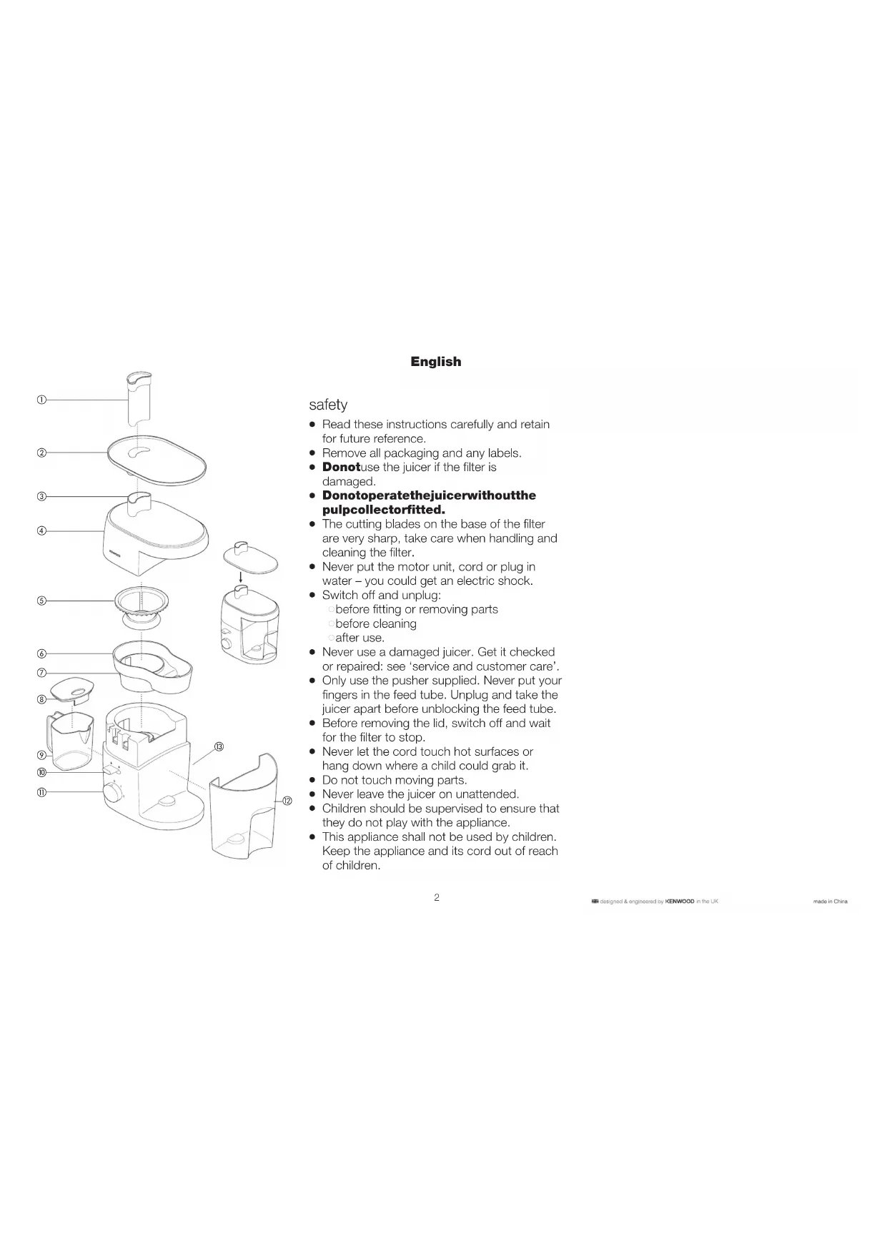 This appliance conforms to EC directive 2004/108/EC on Electromagnetic Compatibility and EC regulation no. 1935/2004 of 27/10/2004 on materials intended for contact with food. before using for the first time 1 Remove all packaging. 2 Wash the parts: see 'care and cleaning'. key 햲 pusher 햳 hopper 햴 feed tube 햵 lid 햶 filter 햷 filter holder 햸 juice outlet 햹 lid with foam separator 햺 juice jug 햻 interlock 햽 On/Off speed control 햾 pulp collector 햿 cord storage (at the back) using your juicer assembly and use 1 Slide the pulp collector 햾 into position and fit the filter holder 햷. 2 Fit the filter 햶 inside the filter holder. 3 Fit the lid 햵. Then push down firmly on the feed tube and slide the interlock switch 햻 to lock.