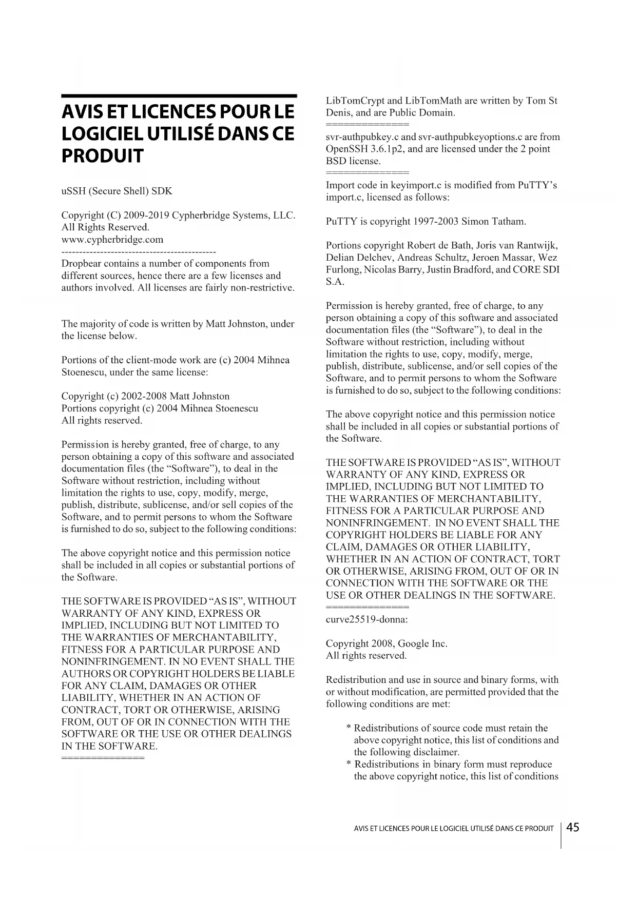 - Redistributions in binary form must reproduce the above copyright notice, this list of conditionsAVIS ET LICENCES POUR LE LOGICIEL UTILISÉ DANS CE PRODUIT