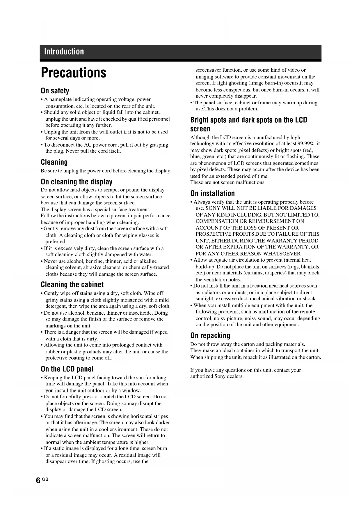 - When you install multiple equipment with the unit, the following problems, such as malfunction of the remote control, noisy picture, noisy sound, may occur depending on the position of the unit and other equipment. On repacking Do not throw away the carton and packing materials. They make an ideal container in which to transport the unit. When shipping the unit, repack it as illustrated on the carton. If you have any questions on this unit, contact your authorized Sony dealers. Introduction7