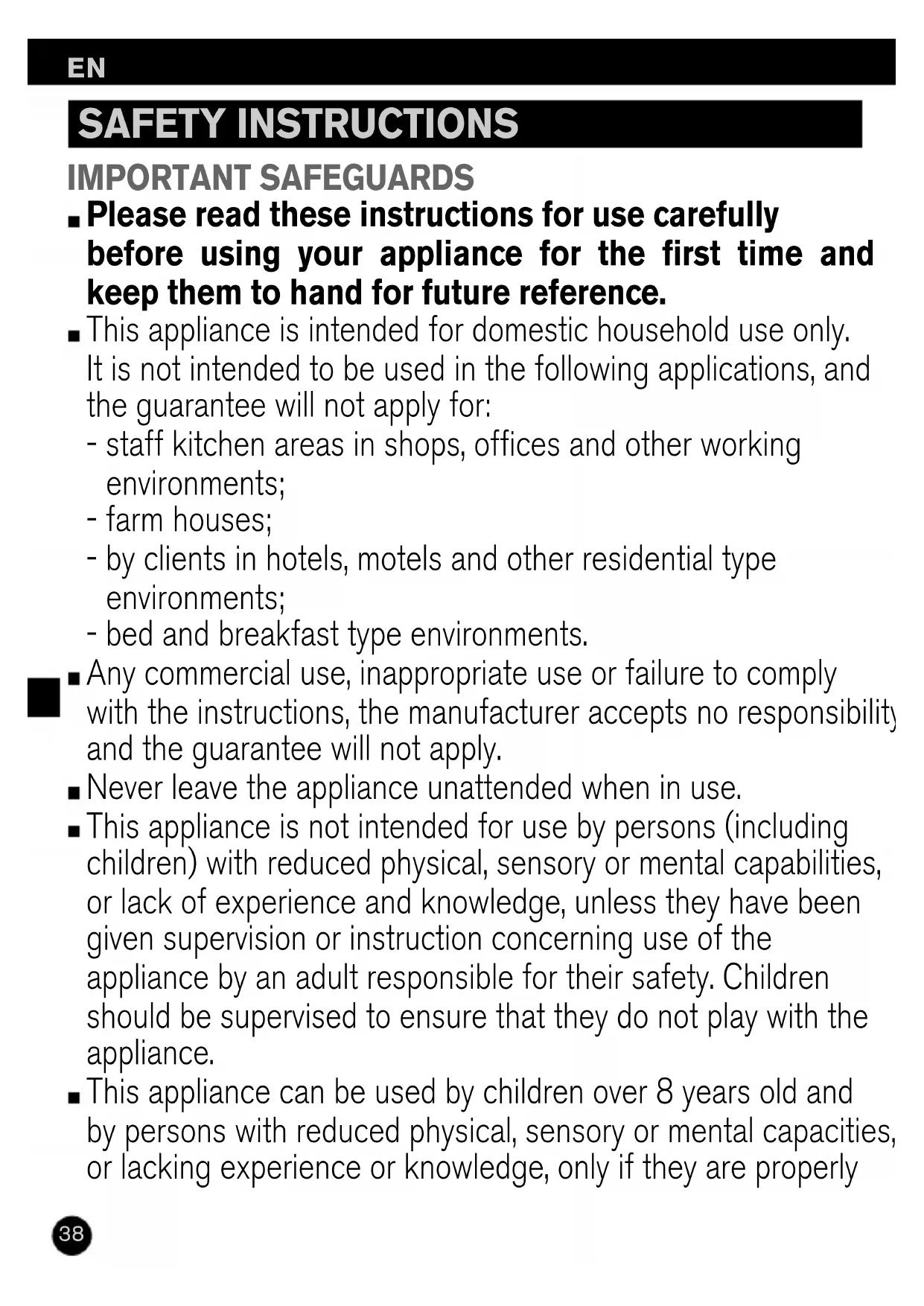 IMPORTANT SAFEGUARDS Please read these instructions for use carefully before using your appliance for the first time and keep them to hand for future reference. This appliance is intended for domestic household use only. It is not intended to be used in the following applications, and the guarantee will not apply for: - staff kitchen areas in shops, offices and other working environments; - farm houses; - by clients in hotels, motels and other residential type environments; - bed and breakfast type environments. Any commercial use, inappropriate use or failure to comply with the instructions, the manufacturer accepts no responsibility and the guarantee will not apply. Never leave the appliance unattended when in use. This appliance is not intended for use by persons (including children) with reduced physical, sensory or mental capabilities, or lack of experience and knowledge, unless they have been given supervision or instruction concerning use of the appliance by an adult responsible for their safety. Children should be supervised to ensure that they do not play with the appliance. This appliance can be used by children over 8 years old and by persons with reduced physical, sensory or mental capacities, or lacking experience or knowledge, only if they are properly SAFETY INSTRUCTIONS KRPS-GRILPLANCH-2100075680 19/02/13 11:40 Page3839