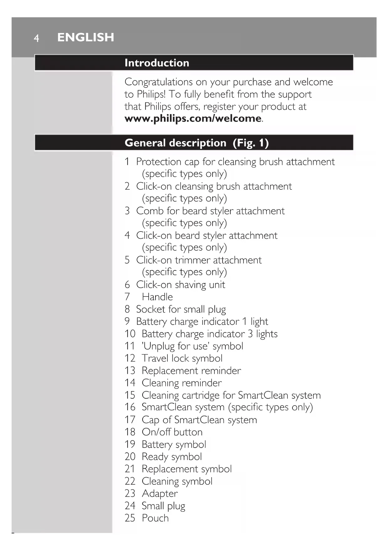 Introduction Congratulations on your purchase and welcome to Philips! To fully benet from the support that Philips offers, register your product at www.philips.com/welcome. General description (Fig. 1) 1 Protection cap for cleansing brush attachment (specic types only) 2 Click-on cleansing brush attachment (specic types only) 3 Comb for beard styler attachment (specic types only) 4 Click-on beard styler attachment (specic types only) 5 Click-on trimmer attachment (specic types only) 6 Click-on shaving unit 7 Handle 8 Socket for small plug 9 Battery charge indicator 1 light 10 Battery charge indicator 3 lights 11 ’Unplug for use’ symbol 12 Travel lock symbol 13 Replacement reminder 14 Cleaning reminder 15 Cleaning cartridge for SmartClean system 16 SmartClean system (specic types only) 17 Cap of SmartClean system 18 On/off button 19 Battery symbol 20 Ready symbol 21 Replacement symbol 22 Cleaning symbol 23 Adapter 24 Small plug 25 Pouch ENGLISHNote: The accessories supplied may vary for different products. The box shows the accessories that have been supplied with your appliance. Important safety information Read this important information carefully before you use the appliance and its accessories and save it for future reference. The accessories supplied may vary for different products. Danger - Keep the adapter dry. Warning - The adapter contains a transformer. Do not cut off the adapter to replace it with another plug, as this causes a hazardous situation. - This appliance can be used by children aged from 8 years and above and persons with reduced physical, sensory or mental capabilities or lack of experience and knowledge if they have been given supervision or instruction concerning use of the appliance in a safe way and understand the hazards involved. Children shall not play with the appliance. Cleaning and user maintenance shall not be made by children without supervision. - Always unplug the shaver before you clean it under the tap. - Always check the appliance before you use it. Do not use the appliance if it is damaged, as this may cause injury. Always replace a damaged part with one of the original type. ENGLISH 5Caution - Never immerse the cleaning system or the charging stand in water and do not rinse it under the tap. - Never use water hotter than 80°C to rinse the shaver. - Only use this appliance for its intended purpose as shown in the user manual. - For hygienic reasons, the appliance should only be used by one person. - Never use compressed air, scouring pads, abrasive cleaning agents or aggressive liquids such as petrol or acetone to clean the appliance. - If your shaver comes with a cleaning system, always use the original Philips cleaning uid (cartridge or bottle, depending on the type of cleaning system). - Always place the cleaning system on a stable, level and horizontal surface to prevent leakage. - If your cleaning system uses a cleaning cartridge, always make sure that the cartridge compartment is closed before you use the cleaning system to clean or charge the shaver. - When the cleaning system is ready for use, do not move it to prevent leakage of cleaning uid. - Do not use the adapter in or near wall sockets that contain or have contained an electric air freshener to prevent irreparable damage to the adapter. - Water may drip from the socket at the bottom of the shaver when you rinse it. This is normal and not dangerous because all electronics are enclosed in a sealed power unit inside the shaver. ENGLISH6Electromagnetic elds (EMF) - This Philips appliance complies with all applicable standards and regulations regarding exposure to electromagnetic elds. General - This shaver is waterproof. It is suitable for use in the bath or shower and for cleaning under the tap. For safety reasons, the shaver can therefore only be used without cord. - The appliance is suitable for mains voltages ranging from 100 to 240 volts. - The adapter transforms 100-240 volts to a safe low voltage of less than 24 volts. - Maximum noise level: Lc = 69dB(A) The display Charging Battery charge indicator with 3 lights - Charging takes approx. 1 hour. - Quick charge: When the appliance is connected to the mains, the lights of the battery charge indicator light up one after the other continuously. When the appliance contains enough energy for one shave, the bottom light of the battery charge indicator starts ashing slowly. - If you leave the appliance connected to the mains, the charging process continues. To indicate that the appliance is charging, rst the bottom light ashes and then lights up continuously. Then the second light ashes and then lights up continuously, and so on until the appliance is fully charged. ENGLISH 7Battery charge indicator with 1 light - Charging takes approx. 1 hour. - Quick charge: When the appliance does not contain enough energy for one shave, the battery charge indicator ashes fast. When the battery charge indicator starts to ash slowly, the appliance contains enough energy for one shave. - If you leave the appliance connected to the mains, the charging process continues. To indicate that the appliance is charging, the battery charge indicator ashes slowly. Battery fully charged Note: This appliance can only be used without a cord. Note: When the battery is full, the display switches off automatically after 30 minutes. If you press the on/off button during charging, the ‘unplug for use’ symbol ashes white to remind you that you have to disconnect the appliance from the mains. When the battery is fully charged, all lights of the battery charge indicator light up continuously. - Battery charge indicator with 3 lights - Battery charge indicator with 1 light ENGLISH8Battery low When the battery is almost empty, the bottom light ashes orange. - Battery charge indicator with 3 lights - Battery charge indicator with 1 light Remaining battery capacity Battery charge indicator with 3 lights - The remaining battery capacity is indicated by the lights of the b