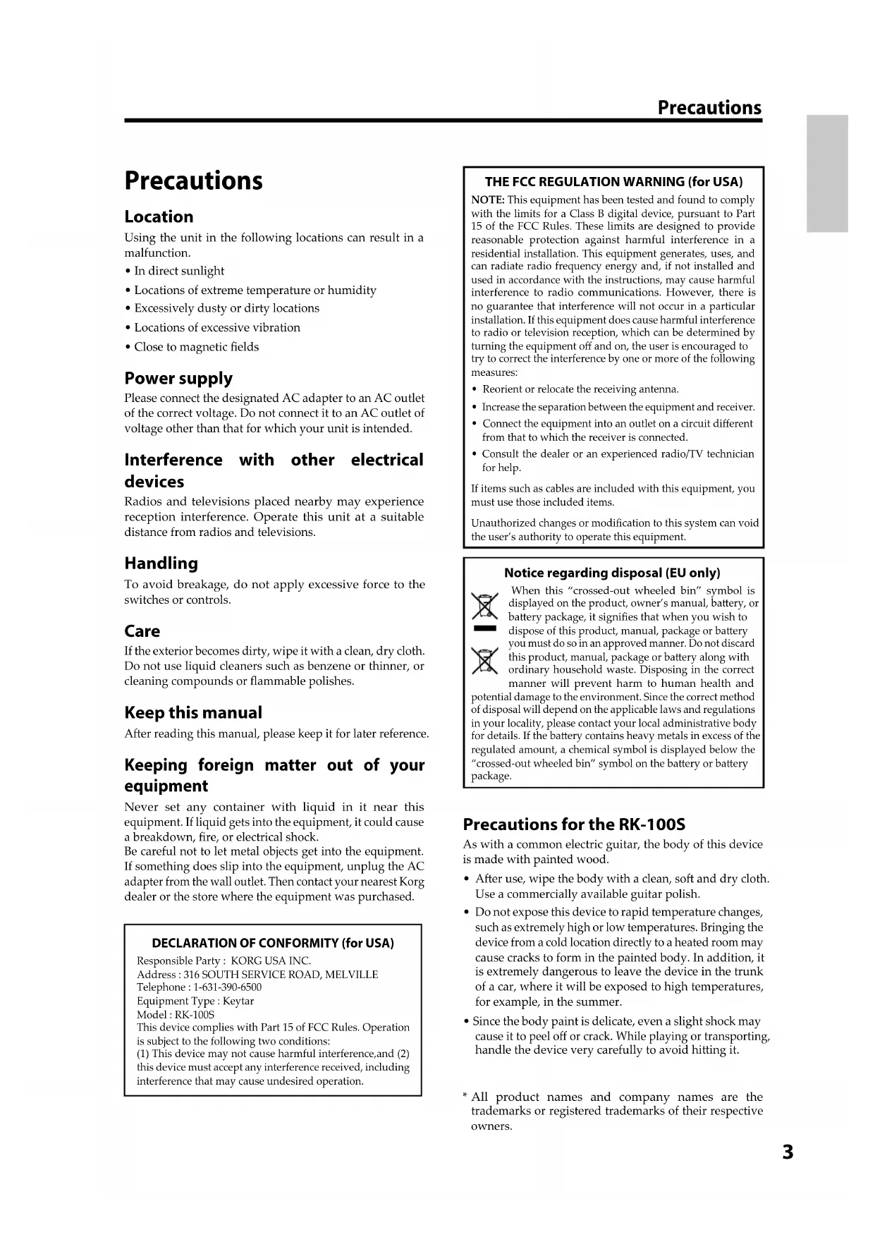 DECLARATION OF CONFORMITY (for USA) Responsible Party : KORG USA INC.Address : 316 SOUTH SERVICE ROAD, MELVILLETelephone : 1-631-390-6500Equipment Type : KeytarModel : RK-100SThis device complies with Part 15 of FCC Rules. Operation is subject to the following two conditions:(1) This device may not cause harmful interference,and (2) this device must accept any interference received, including interference that may cause undesired operation. THE FCC REGULATION WARNING (for USA) NOTE: This equipment has been tested and found to comply with the limits for a Class B digital device, pursuant to Part 15 of the FCC Rules. These limits are designed to provide reasonable protection against harmful interference in a residential installation. This equipment generates, uses, and can radiate radio frequency energy and, if not installed and used in accordance with the instructions, may cause harmful interference to radio communications. However, there is no guarantee that interference will not occur in a particular installation. If this equipment does cause harmful interference to radio or television reception, which can be determined by turning the equipment o and on, the user is encouraged to try to correct the interference by one or more of the following measures:• Reorient or relocate the receiving antenna. Increase the separation between the equipment and receiver.• Connect the equipment into an outlet on a circuit dierent from that to which the receiver is connected. Consult the dealer or an experienced radio/TV technician for help.If items such as cables are included with this equipment, you must use those included items. Unauthorized changes or modication to this system can void the user’s authority to operate this equipment. Notice regarding disposal (EU only) When this “crossed-out wheeled bin” symbol is displayed on the product, owner’s manual, baery, or baery package, it signies that when you wish to dispose of this product, manual, package or baery you must do so in an approved manner. Do not discard this product, manual, package or baery along with ordinary household waste. Disposing in the correct manner will prevent harm to human health and potential damage to the environment. Since the correct method of disposal will depend on the applicable laws and regulations in your locality, please contact your local administrative body for details. If the baery contains heavy metals in excess of the regulated amount, a chemical symbol is displayed below the “crossed-out wheeled bin” symbol on the baery or baery package. Precautions for the RK-100S As with a common electric guitar, the body of this device is made with painted wood. Aer use, wipe the body with a clean, so and dry cloth. Use a commercially available guitar polish. Do not expose this device to rapid temperature changes, such as extremely high or low temperatures. Bringing the device from a cold location directly to a heated room may cause cracks to form in the painted body. In addition, it is extremely dangerous to leave the device in the trunk of a car, where it will be exposed to high temperatures, for example, in the summer.• Since the body paint is delicate, even a slight shock may cause it to peel o or crack. While playing or transporting, handle the device very carefully to avoid hiing it. All product names and company names are the trademarks or registered trademarks of their respective owners.RK-100S Owner's manual