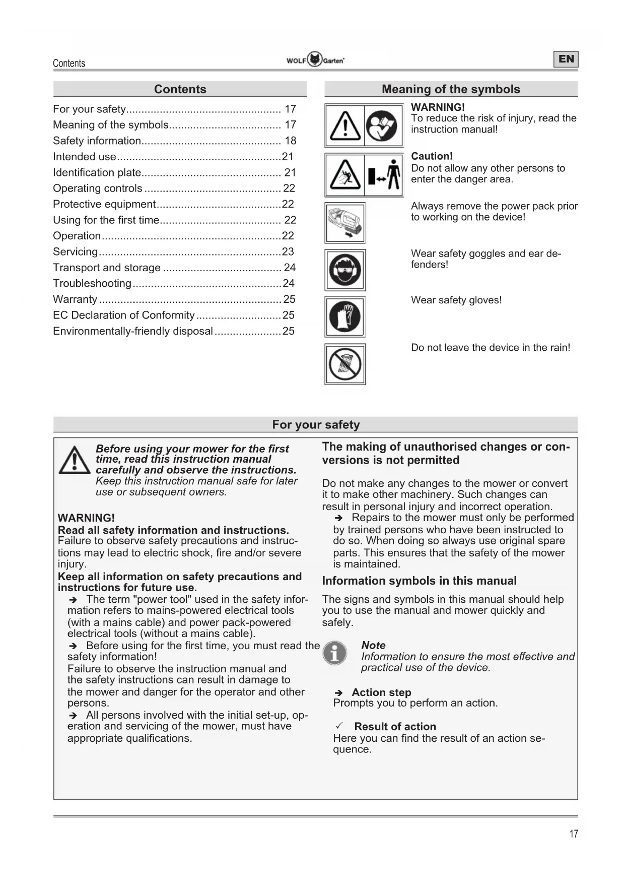 - Environmentally-friendly disposal Meaning of the symbols WARNING! To reduce the risk of injury, read the instruction manual! Caution! Do not allow any other persons to enter the danger area. Always remove the power pack prior to working on the device! Wear safety goggles and ear de- fenders! Wear safety gloves! Do not leave the device in the rain! For your safetyFor your safety p. 25