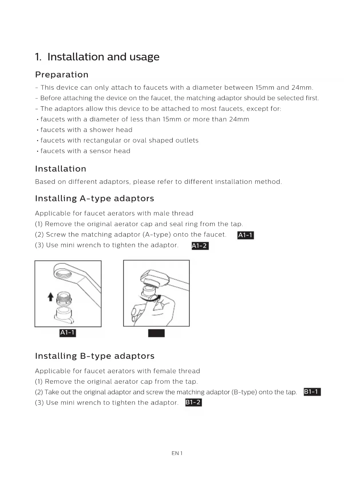 - faucets with a sensor head Installation Preparation Based on different adaptors, please refer to different installation method. Installing A-type adaptors Applicable for faucet aerators with male thread (1) Remove the original aerator cap and seal ring from the tap. (2) Screw the matching adaptor (A-type) onto the faucet. (3) Use mini wrench to tighten the adaptor. Installing B-type adaptors Applicable for faucet aerators with female thread (1) Remove the original aerator cap from the tap. (2) Take out the original adaptor and screw the matching adaptor (B-type) onto the tap. (3) Use mini wrench to tighten the adaptor. EN 1 B1-1 B1-2 A1-1 A1-1 A1-2 A1-2Installing C-type adaptor Applicable for faucets other than A or B with a diameter of 15mm-21mm. Please prepare a slotted screwdriver in advance before installing. C-type adaptor. (1) Whether the inner or the outer seal ring of C-type adaptor is necessary depends on the dimension of the faucet outlet. (2) Combine the B-type adaptor with the C-type adaptor. (3) Adjust and screw the combined adaptors onto faucet. Caution