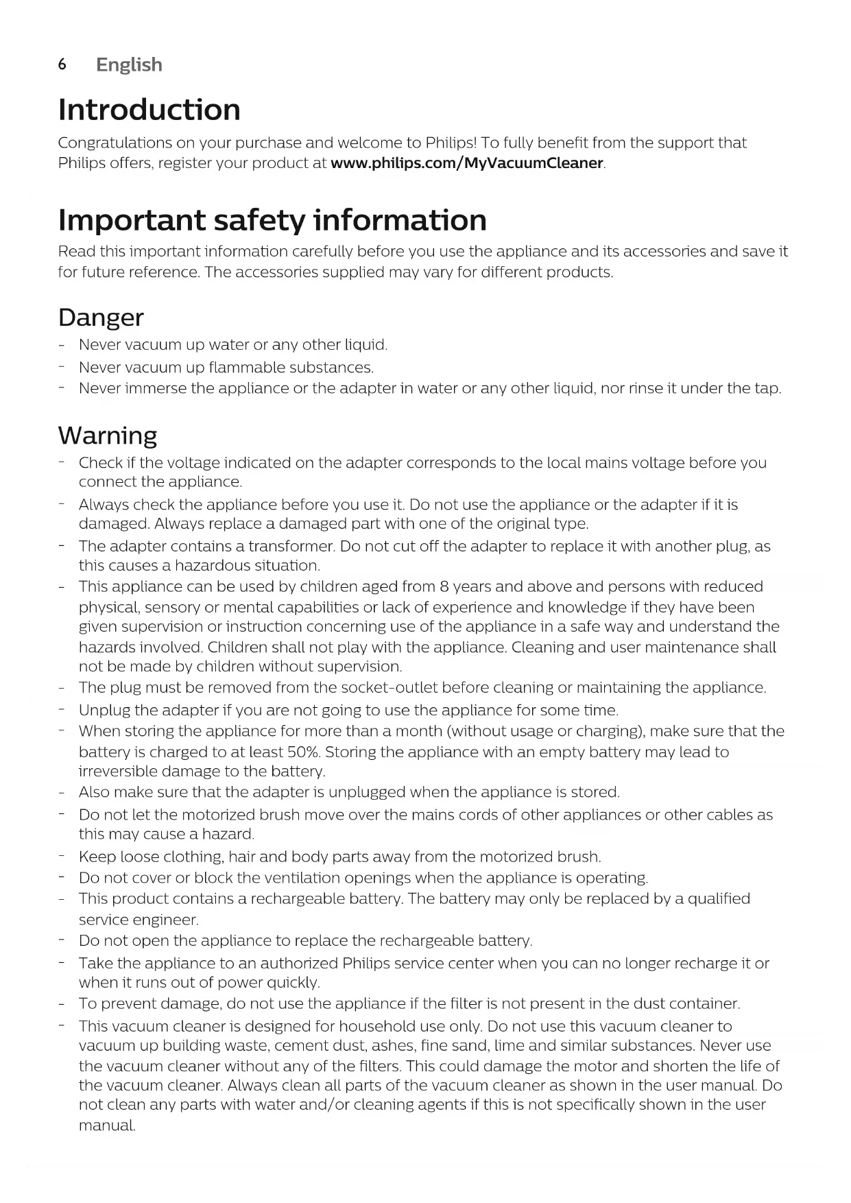 English Introduction Congratulations on your purchase and welcome to Philips! To fully benefit from the support that Philips offers, register your product at www.philips.com/MyVacuumCleaner. Important safety information Read this important information carefully before you use the appliance and its accessories and save it for future reference. The accessories supplied may vary for different products. Danger