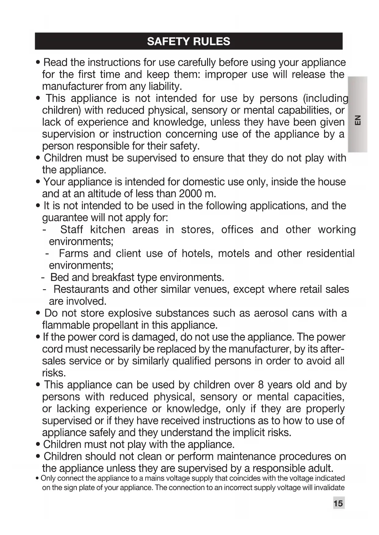 - Your appliance is intended for domestic use only, inside the house and at an altitude of less than 2000 m.