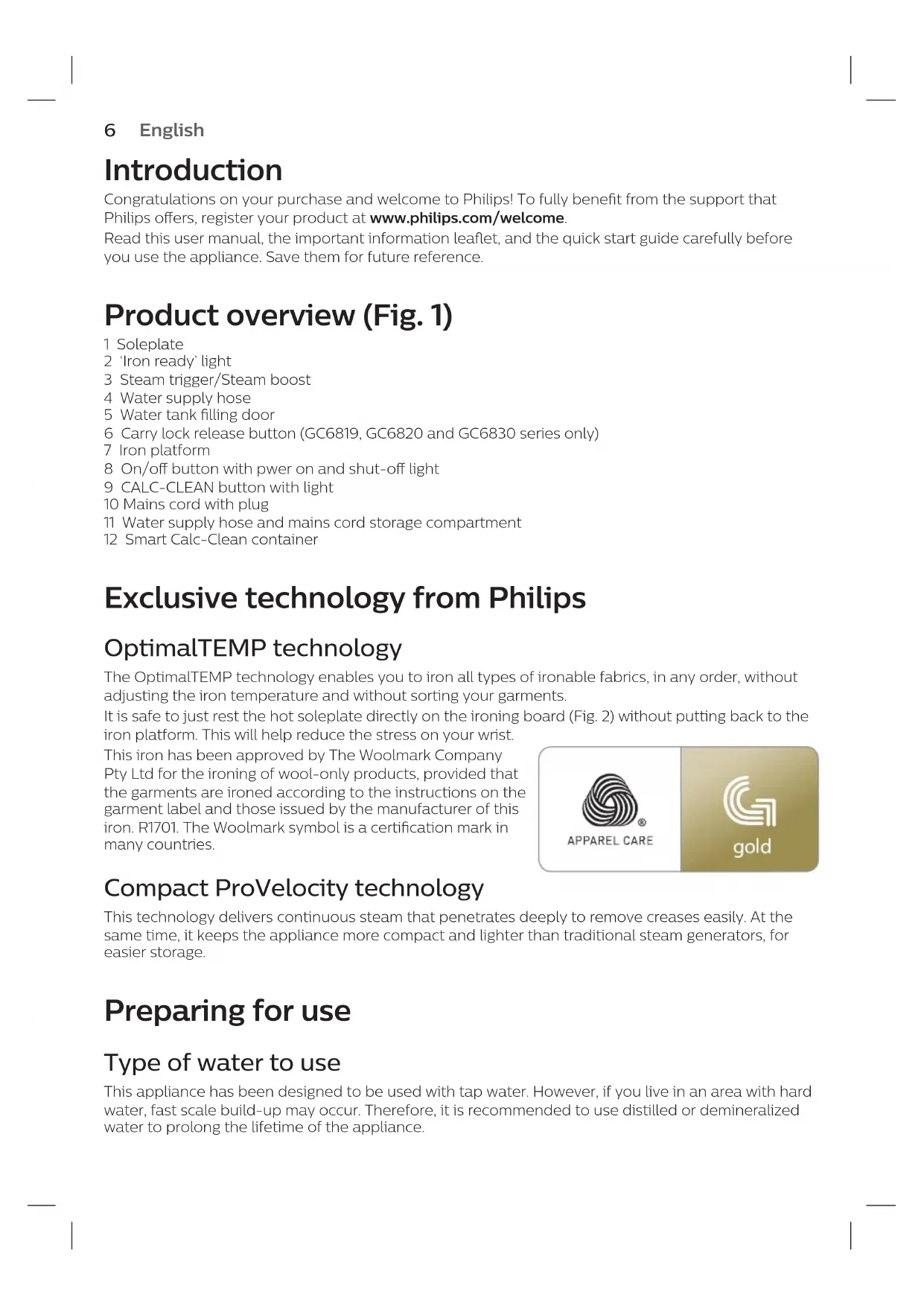 1English 6 Dansk 12 Deutsch 18 Español 25 Français 32 Italiano 39 Nederlands 46 Norsk 52 Português 58 Suomi 65 Svenska 716 Introduction Congratulations on your purchase and welcome to Philips! To fully benet from the support that Philips oers, register your product at www.philips.com/welcome. Read this user manual, the important information leaet, and the quick start guide carefully before you use the appliance. Save them for future reference. Product overview (Fig. 1) 1 Soleplate 2 ‘Iron ready’ light 3 Steam trigger/Steam boost 4 Water supply hose 5 Water tank lling door 6 Carry lock release button (GC6819, GC6820 and GC6830 series only) 7 Iron platform 8 On/o button with pwer on and shut-o light 9 CALC-CLEAN button with light 10 Mains cord with plug 11 Water supply hose and mains cord storage compartment 12 Smart Calc-Clean container Exclusive technology from Philips OptimalTEMP technology The OptimalTEMP technology enables you to iron all types of ironable fabrics, in any order, without adjusting the iron temperature and without sorting your garments. It is safe to just rest the hot soleplate directly on the ironing board (Fig. 2) without putting back to the iron platform. This will help reduce the stress on your wrist. This iron has been approved by The Woolmark Company Pty Ltd for the ironing of wool-only products, provided that the garments are ironed according to the instructions on the garment label and those issued by the manufacturer of this iron. R1701. The Woolmark symbol is a certication mark in many countries. Compact ProVelocity technology This technology delivers continuous steam that penetrates deeply to remove creases easily. At the same time, it keeps the appliance more compact and lighter than traditional steam generators, for easier storage. Preparing for use Type of water to use This appliance has been designed to be used with tap water. However, if you live in an area with hard water, fast scale build-up may occur. Therefore, it is recommended to use distilled or demineralized water to prolong the lifetime of the appliance. English7