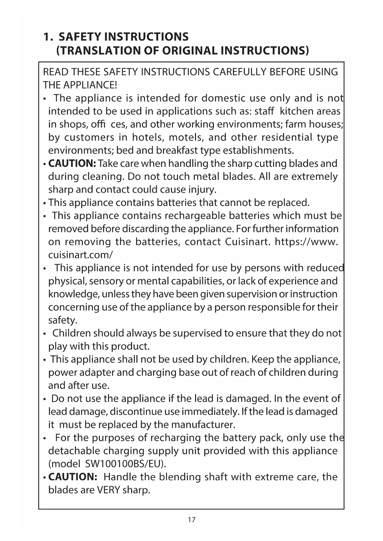 - For the purposes of recharging the battery pack, only use the detachable charging supply unit provided with this appliance (model SW100100BS/EU).