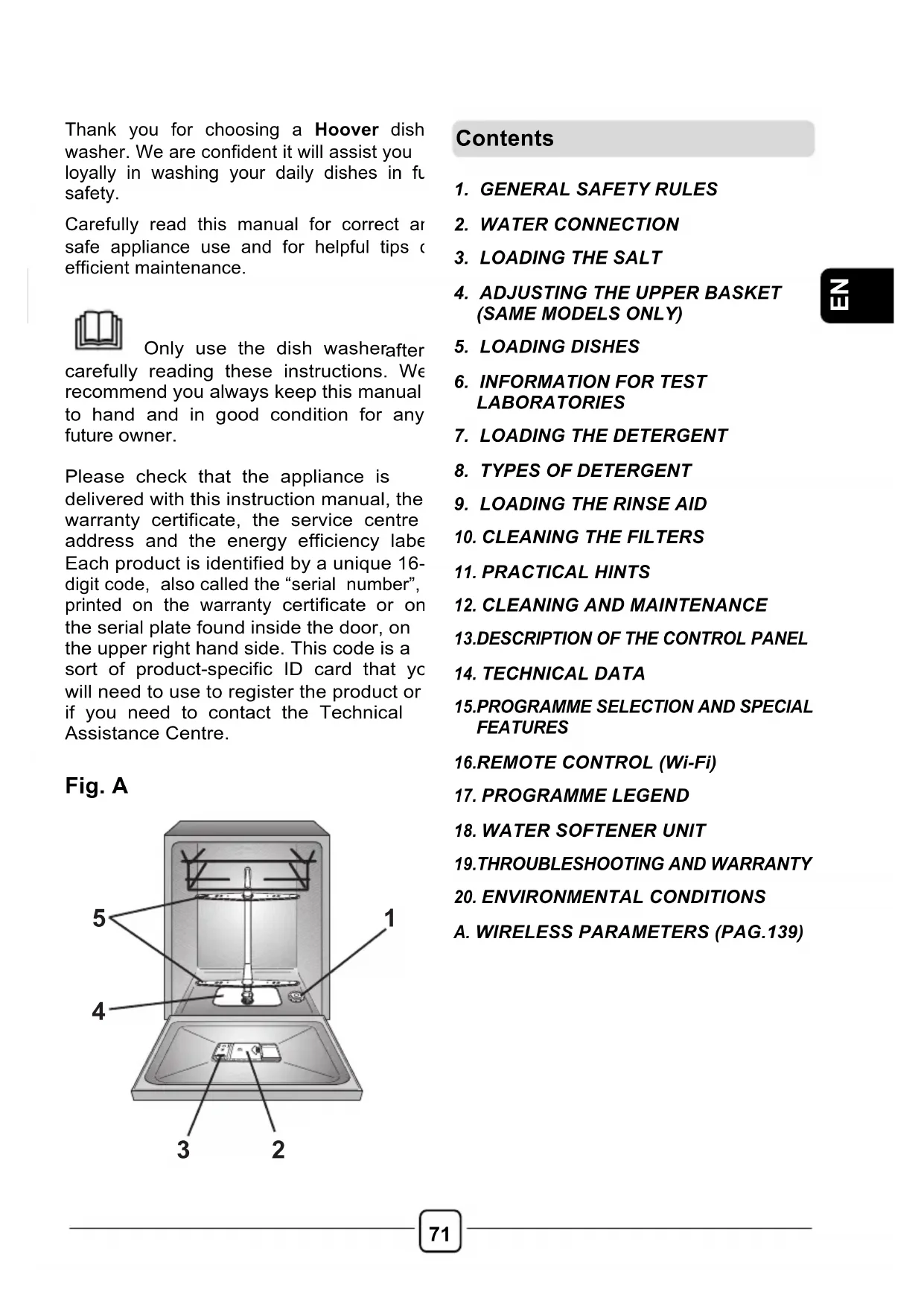 Thank you for choosing a Hoover dish washer. We are confident it will assist you loyally in washing your daily dishes in full safety. Carefully read this manual for correct and safe appliance use and for helpful tips on efficient maintenance. Only use the dish washer after carefully reading these instructions. We recommend you always keep this manual to hand and in good condition for any future owner. Please check that the appliance is delivered with this instruction manual, the warranty certificate, the service centre address and the energy efficiency label. Each product is identified by a unique 16- digit code, also called the “serial number”, printed on the warranty certificate or on the serial plate found inside the door, on the upper right hand side. This code is a sort of product-specific ID card that you will need to use to register the product or if you need to contact the Technical Assistance Centre.