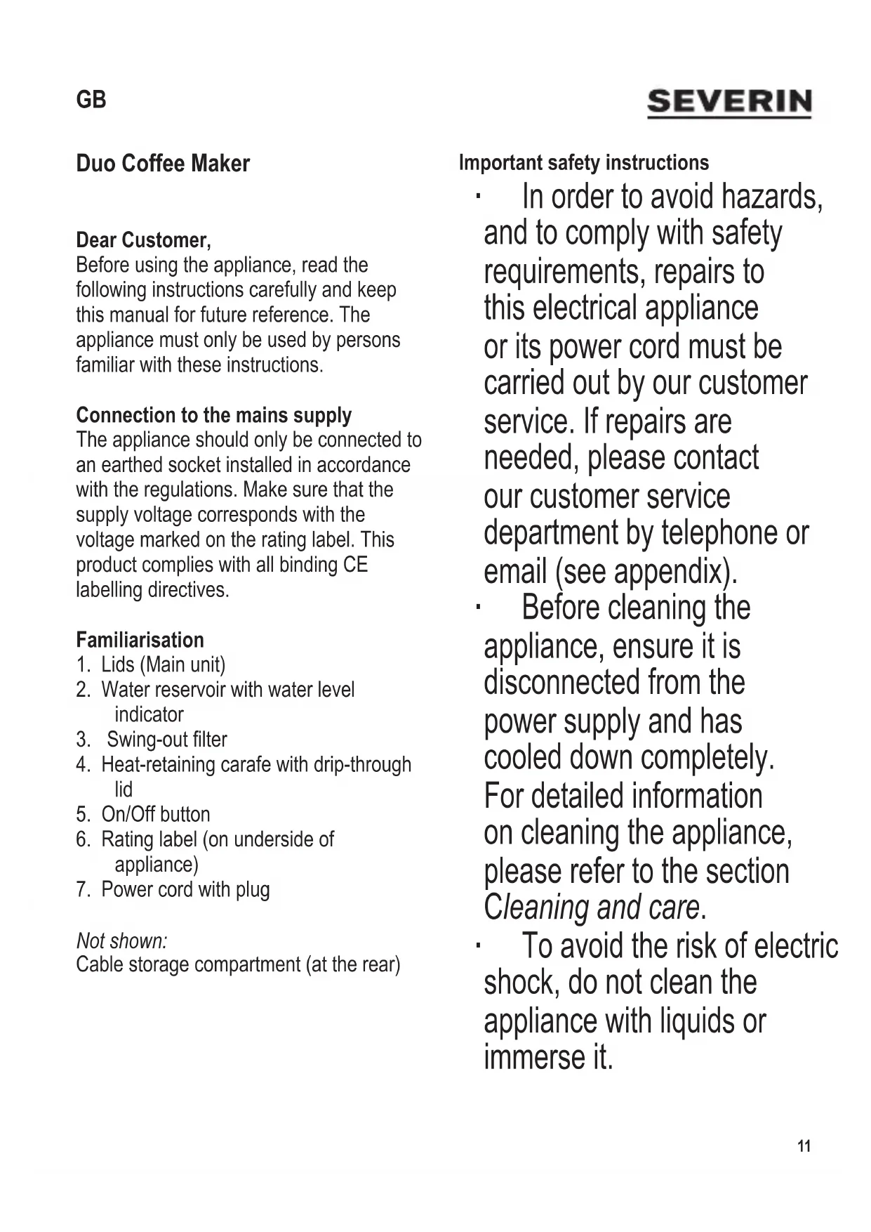 Duo Coffee Maker Dear Customer, Before using the appliance, read the following instructions carefully and keep this manual for future reference. The appliance must only be used by persons familiar with these instructions. Connection to the mains supply The appliance should only be connected to an earthed socket installed in accordance with the regulations. Make sure that the supply voltage corresponds with the voltage marked on the rating label. This product complies with all binding CE labelling directives. Familiarisation