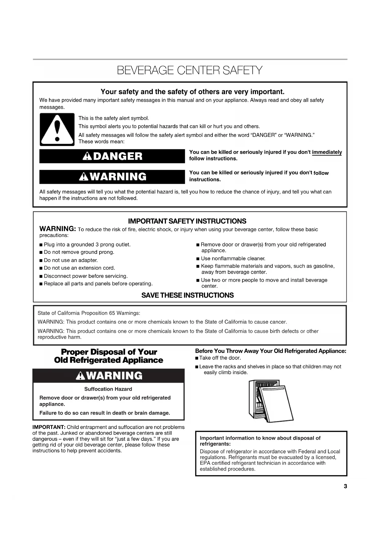 Proper Disposal of Your Old Refrigerated Appliance IMPORTANT: Child entrapment and suffocation are not problems of the past. Junked or abandoned beverage centers are still dangerous – even if they will sit for “just a few days.” If you are getting rid of your old beverage center, please follow these instructions to help prevent accidents.Before You Throw Away Your Old Refrigerated Appliance:■ Take off the door.■ Leave the racks and shelves in place so that children may not easily climb inside. You can be killed or seriously injured if you don't immediately You can be killed or seriously injured if you don'tfollow All safety messages will tell you what the potential hazard is, tell you how to reduce the chance of injury, and tell you what can happen if the instructions are not followed. Your safety and the safety of others are very important. We have provided many important safety messages in this manual and on your appliance. Always read and obey all safety messages.This is the safety alert symbol.This symbol alerts you to potential hazards that can kill or hurt you and others.All safety messages will follow the safety alert symbol and either the word “DANGER” or “WARNING.”These words mean:follow instructions.instructions. DANGER WARNING