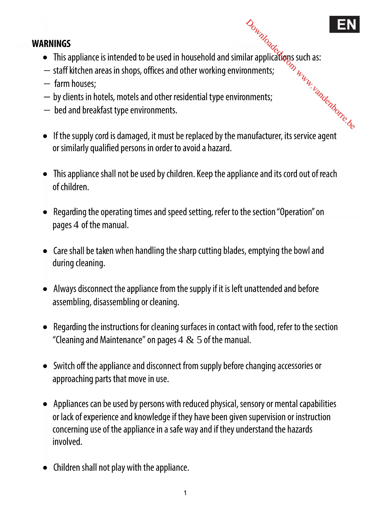 Downloaded from www.vandenborre.beWARNINGS This appliance is intended to be used in household and similar applications such as: − staff kitchen areas in shops, offices and other working environments; − farm houses; − by clients in hotels, motels and other residential type environments; − bed and breakfast type environments. If the supply cord is damaged, it must be replaced by the manufacturer, its service agent or similarly qualified persons in order to avoid a hazard. This appliance shall not be used by children. Keep the appliance and its cord out of reach of children. Regarding the operating times and speed setting, refer to the section “Operation” on pages 4 of the manual. Care shall be tak en when handling the sharp c utting blades, emptying the bowl and during cleaning. Alw ays disconnect the appliance from the supply if it is left unattended and before assembling, disassembling or cleaning. Regarding the instructions for cleaning surfaces in contact with food, refer to the section “Cleaning and Maintenance” on pages 4 & 5 of the manual. Switch off the appliance and disconnect from supply before changing acc essories or approaching parts that move in use. Appliances can be used by persons with reduced physical, sensory or mental capabilities or lack of experience and knowledge if they have been given supervision or instruction concerning use of the appliance in a safe way and if they understand the hazards involved. Children shall not play with the appliance.
