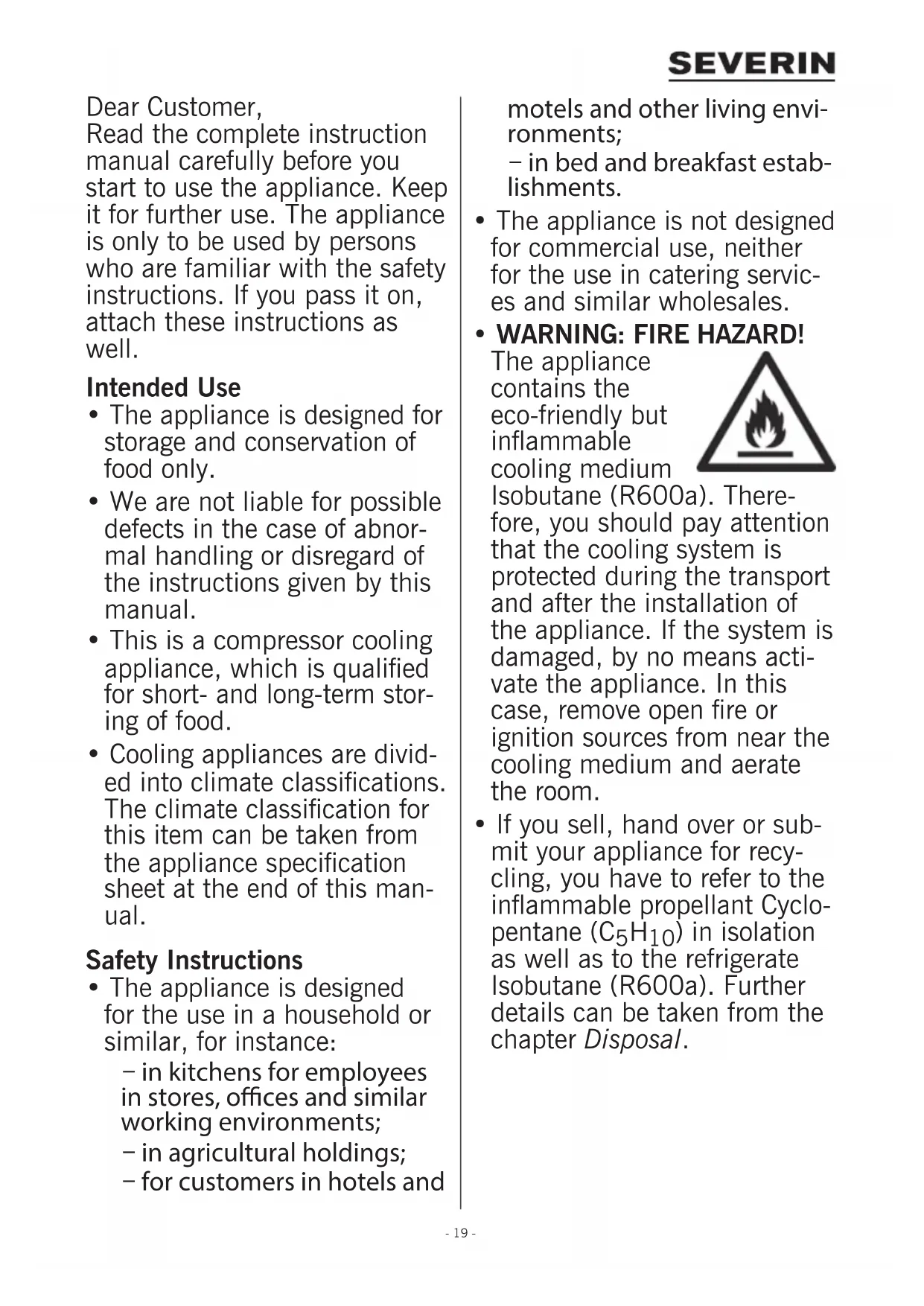 - If you sell, hand over or sub- mit your appliance for recy- cling, you have to refer to the inammablepropellantCyclo- pentane (C