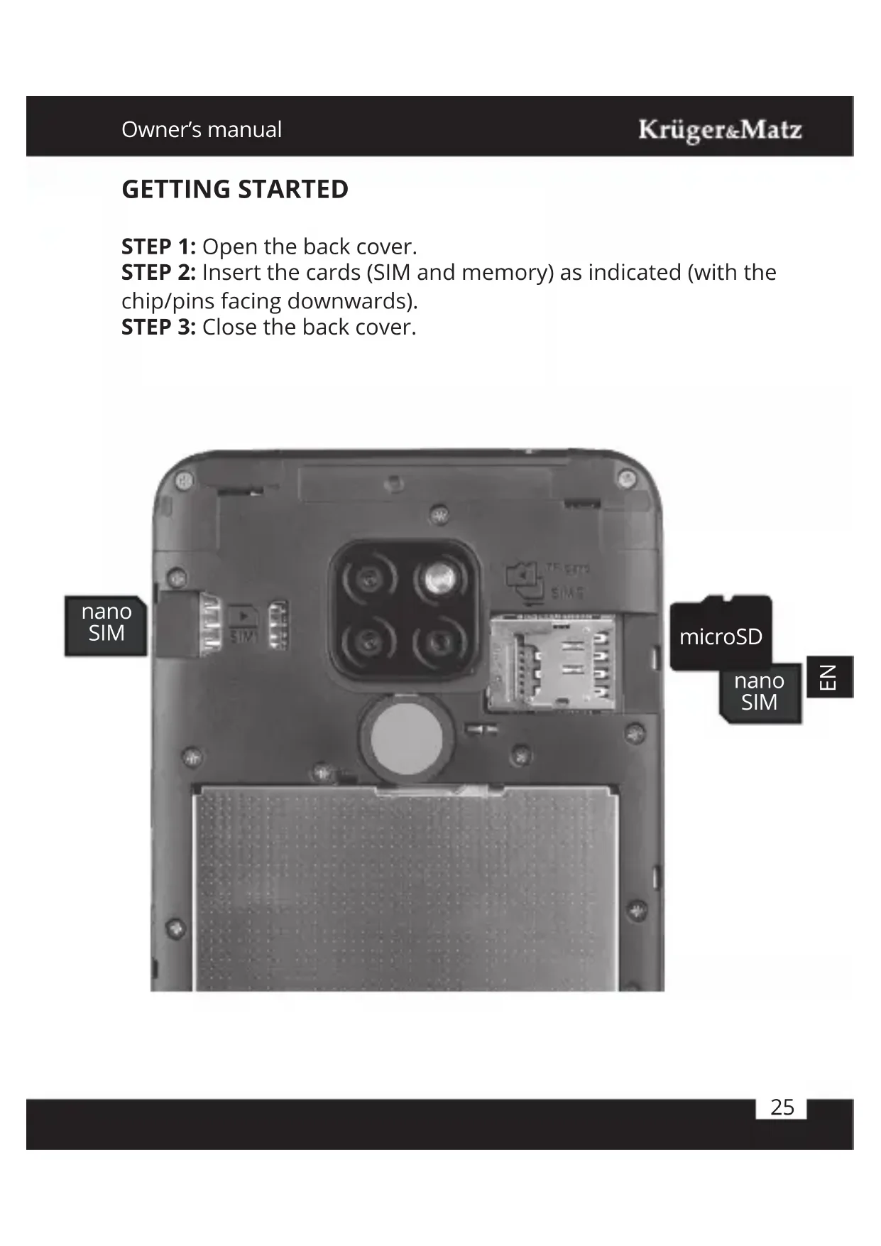 GETTING STARTED STEP 1: Open the back cover. STEP 2: Insert the cards (SIM and memory) as indicated (with the chip/pins facing downwards). STEP 3: Close the back cover. microSD nano SIM nano SIMOwner’s manual
