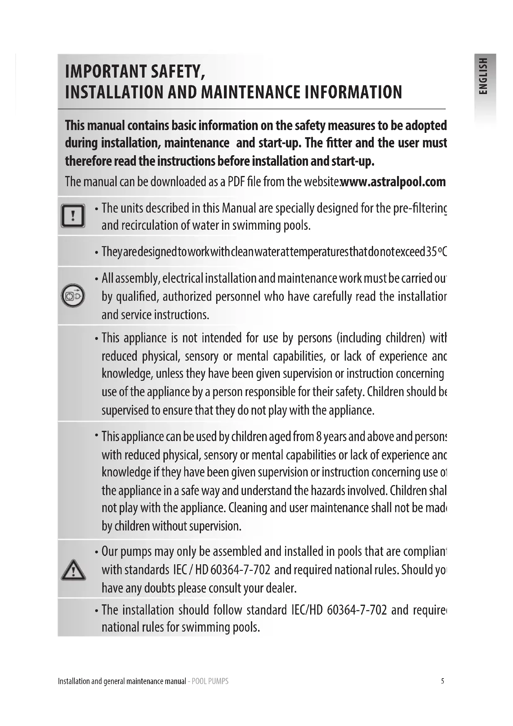 This manual contains basic information on the safety measures to be adopted during installation, maintenance and start-up. The tter and the user must therefore read the instructions before installation and start-up. The manual can be downloaded as a PDF le from the website: www.astralpool.com
