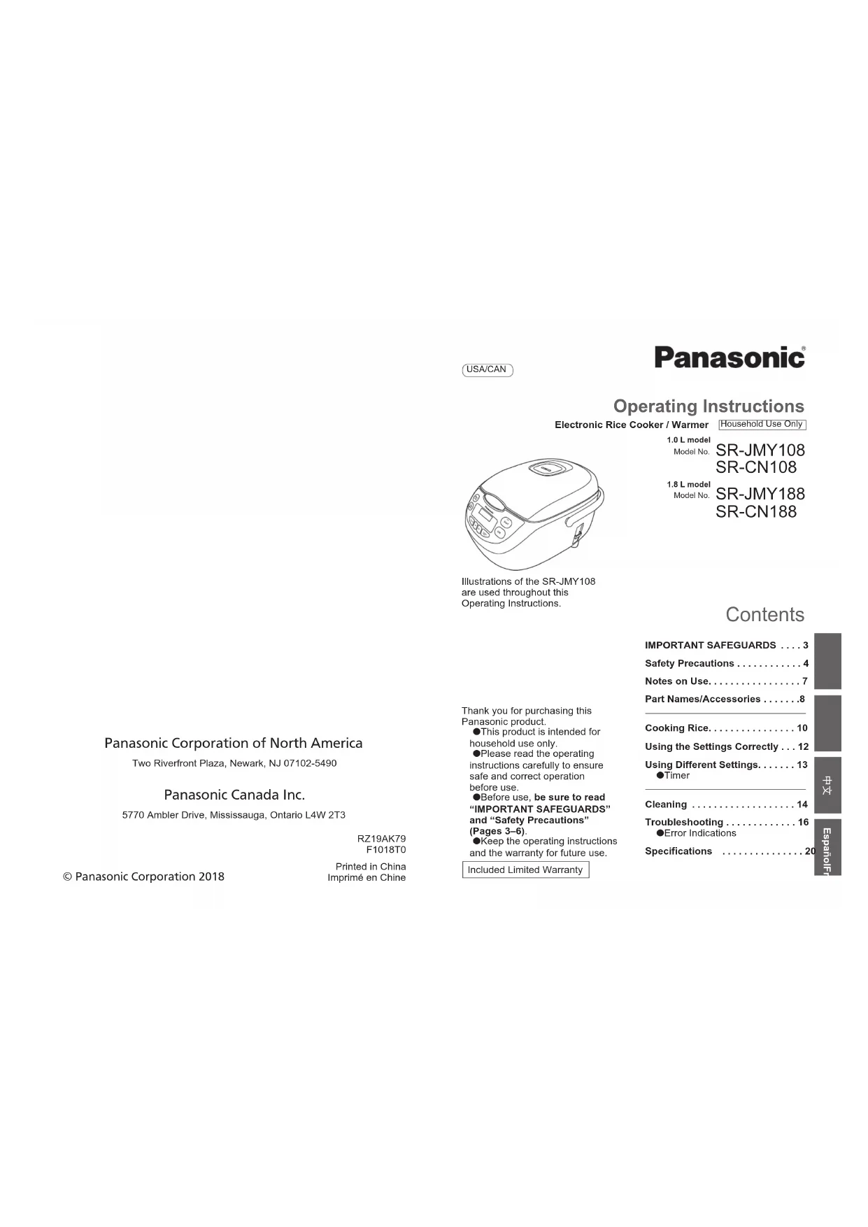 - OOError IndicationsSpecications USA/CAN Panasonic Corporation of North America Two Riverfront Plaza, Newark, NJ 07102-5490 Panasonic Canada Inc. 5770 Ambler Drive, Mississauga, Ontario L4W 2T3© Panasonic Corporation 2018RZ19AK79F1018T0Printed in ChinaImprimé en ChineIllustrations of the SR-JMY108 are used throughout this Operating Instructions.EspañolFrançaisEnglish 中文2 3 English When using electrical appliances, basic safety precautions should always be followed, including the following: p. 20