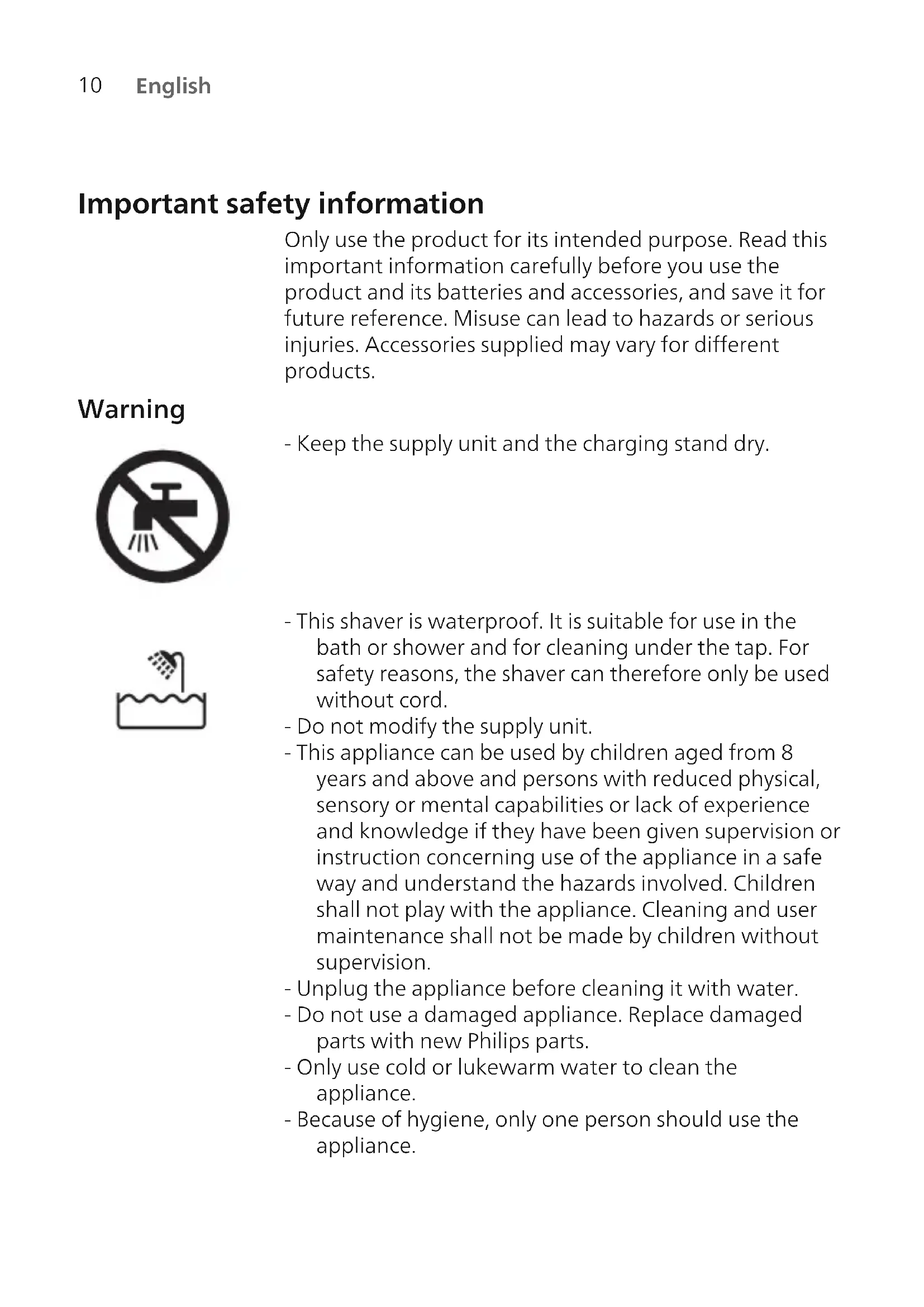 Important safety information Only use the product for its intended purpose. Read this important information carefully before you use the product and its batteries and accessories, and save it for future reference. Misuse can lead to hazards or serious injuries. Accessories supplied may vary for different products. Warning - Keep the supply unit and the charging stand dry. - This shaver is waterproof. It is suitable for use in the bath or shower and for cleaning under the tap. For safety reasons, the shaver can therefore only be used without cord. - Do not modify the supply unit. - This appliance can be used by children aged from 8 years and above and persons with reduced physical, sensory or mental capabilities or lack of experience and knowledge if they have been given supervision or instruction concerning use of the appliance in a safe way and understand the hazards involved. Children shall not play with the appliance. Cleaning and user maintenance shall not be made by children without supervision. - Unplug the appliance before cleaning it with water. - Do not use a damaged appliance. Replace damaged parts with new Philips parts. - Only use cold or lukewarm water to clean the appliance. - Because of hygiene, only one person should use the appliance.11 English - Never use compressed air, scouring pads, abrasive cleaning agents or aggressive liquids to clean the appliance. - Always place the cleaning system on a stable, level and horizontal surface to prevent leakage. - Always make sure the cartridge compartment is closed before you use the cleaning system. - When the cleaning system is ready for use, do not move it to prevent leakage of cleaning fluid. - Water may drip from the socket at the bottom of the shaver when you rinse it. This is normal and not dangerous because all electronics are enclosed in a sealed power unit inside the shaver. - Do not use the supply unit in or near wall sockets that contain an electric air freshener to prevent irreparable damage to the supply unit. - Remove piercings, jewelry, glasses etc. before using the appliance. - Be careful when handling your smartphone near water and in moist environments. - Radio waves may impair the operation of pacemakers and other medical devices. Consult your phycisian for advice and keep the appliance at least 20cm away. - Only use original Philips accessories or consumables. Only use detachable supply unit HQ8505. - Charge, use and store the product at a temperature between 41 °F / 5°C and 95 °F / 35°C. - Keep product and batteries away from fire and do not expose them to direct sunlight or high temperatures. - If the product becomes abnormally hot or smelly, changes color or if charging takes longer than usual, stop using and charging the product and contact Philips. - Do not place products and their batteries in microwave ovens or on induction cookers. - Do not open, modify, pierce, damage or dismantle the product or battery to prevent batteries from heating up or releasing toxic or hazardous substances. Do not short-circuit, overcharge or reverse charge batteries.12 English - If batteries are damaged or leaking, avoid contact with the skin or eyes. If this occurs, immediately rinse well with water and seek medical care. Philips Quick Clean Pod Cartridge fluid - Keep out of reach of children. - Do not swallow. - In case of eye contact, rinse with plenty of water. Electromagnetic fields (EMF) This Philips appliance complies with all applicable standards and regulations regarding exposure to electromagnetic fields. Radio Equipment Directive - S9000 series appliances are equipped with Bluetooth class 2. - The frequency band in which the Bluetooth on S9000 series appliances operates is 2.4GHz. - The maximum radio frequency power radiated in the frequency band in which the S9000 series appliances operate is less than 20 dBm. - This equipment has been so constructed that the product complies with the requirement of Article 10(2) as it can be operated in at least one EU Member State as examined and the product is compliant with Article 10(10) as it has no restrictions on putting into service in all EU member states. - Hereby Philips declares that S9000 series appliances are in compliance with the essential requirements and other relevant provisions of Directive 2014/53/EU. The declaration of conformity may be consulted at www.philips.com/support. What do the icons on the display mean? (Fig. A) - Main Menu You can toggle through the menu items by pressing the menu button. You can also activate or deactivate certain features with a long press.13 English Icon Meaning The main menu shows the status of the battery in percentages. The Motion Control sensor menu icons tell you if the motion during your last shave was good or can be improved You can activate the travel lock in this menu (see 'Main menu (Fig. A)'). Here the display shows that your shaver is not paired to your smartphone. The display shows that your shaver is paired to your smartphone. - Switching the shaver on Press the on/off button to switch on the shaver. Icon Meaning When you switch on the shaver, a short animation with these icons shows which pressure feedback setting you activated (see 'What is my shaver telling me? (Fig. A)'). You can toggle through the pressure feedback settings by pressing the menu button. - Warnings and notifications Icon Meaning The battery is almost empty and you need to charge your shaver (see 'How do I charge my appliance?').14 English When the data storage is almost full, you receive a notification reminding you to synchronize your shaves. To prevent data loss, synchronize the shaver with the app (see 'How do I connect my shaver and smartphone? (Fig. A)'). The shaving unit is soiled or damaged to such an extent that the motor cannot run. Clean the shaving heads thoroughly. You are using the wrong supply unit (see 'How do I charge my appliance?'). Only use the supply unit (HQ8505) that is supplied with the shaver. - Cleaning the shaver I