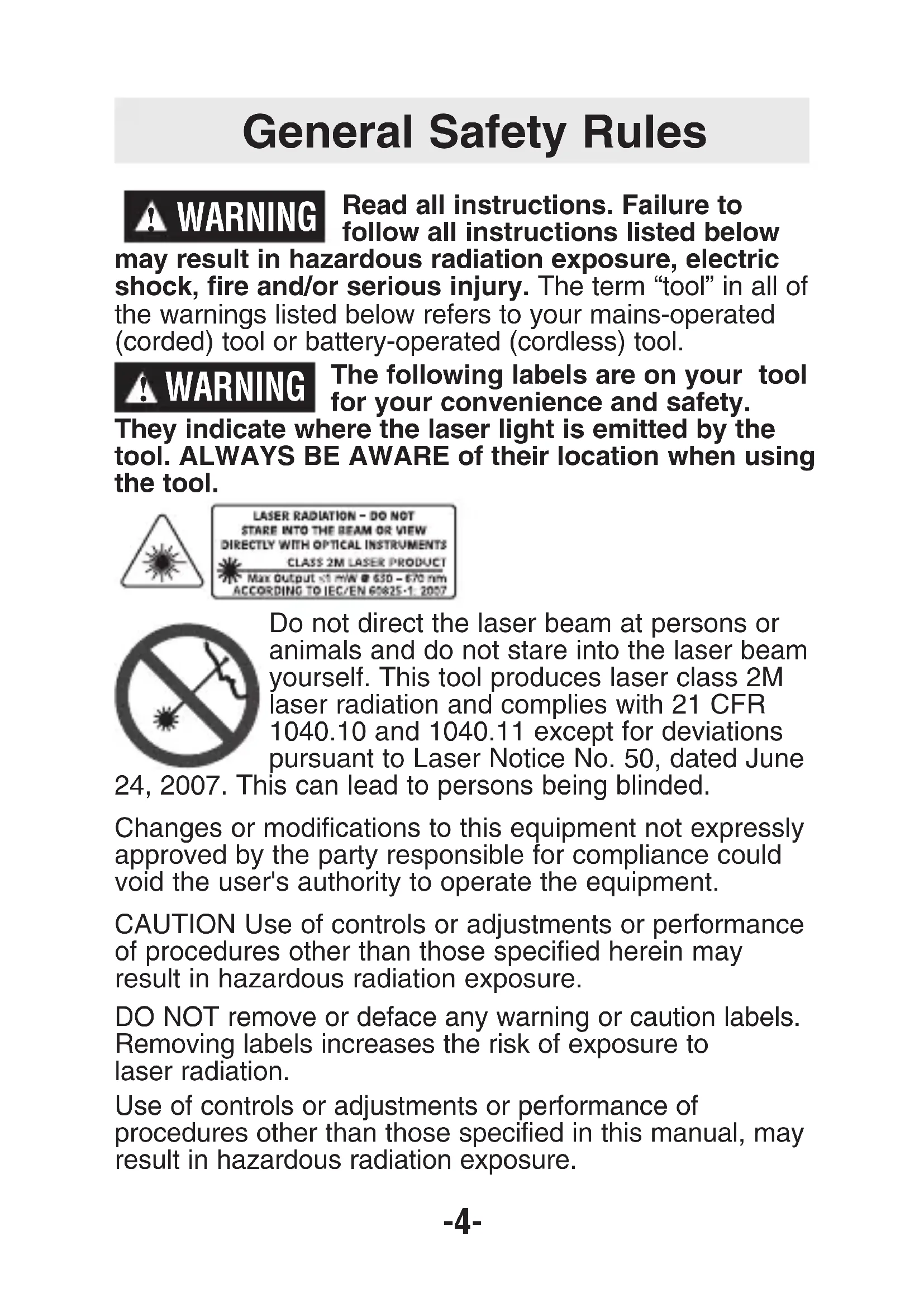 Fig. 3 Fig. 4Read all instructions. Failure to follow all instructions listed below may result in hazardous radiation exposure, electric shock, fire and/or serious injury. The term “tool” in all of the warnings listed below refers to your mains-operated (corded) tool or battery-operated (cordless) tool. The following labels are on your tool for your convenience and safety. They indicate where the laser light is emitted by the tool. ALWAYS BE AWARE of their location when using the tool. Do not direct the laser beam at persons or animals and do not stare into the laser beam yourself. This tool produces laser class 2M laser radiation and complies with 21 CFR 1040.10 and 1040.11 except for deviations pursuant to Laser Notice No. 50, dated June 24, 2007. This can lead to persons being blinded. Changes or modifications to this equipment not expressly approved by the party responsible for compliance could void the user's authority to operate the equipment. CAUTION Use of controls or adjustments or performance of procedures other than those specified herein may result in hazardous radiation exposure. DO NOT remove or deface any warning or caution labels. Removing labels increases the risk of exposure to laser radiation. Use of controls or adjustments or performance of procedures other than those specified in this manual, may result in hazardous radiation exposure.