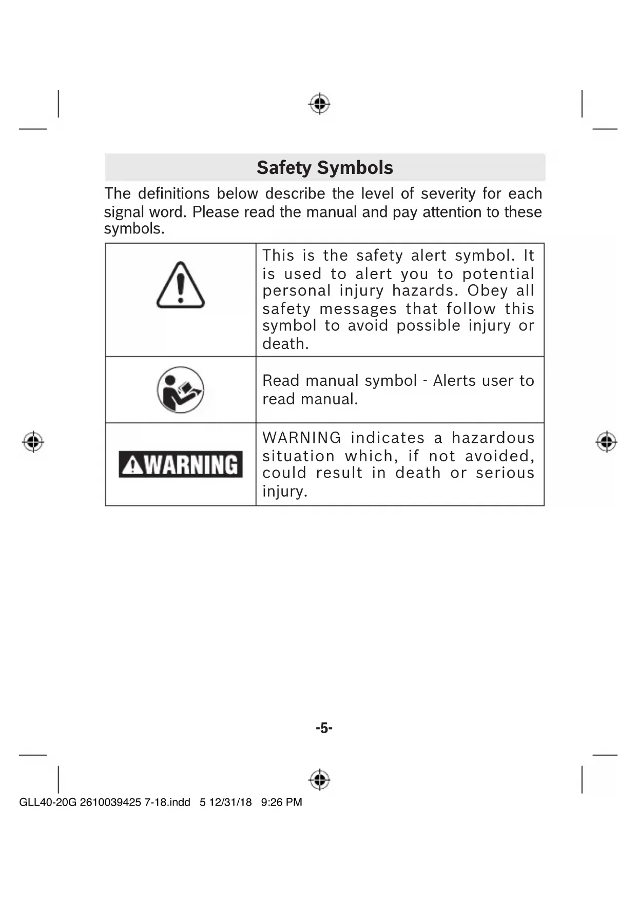 ADVERTENCIA GLL40-20G 2610039425 7-18.indd 4 12/31/18 9:26 PM-5- Safety Symbols The definitions below describe the level of severity for each signal word. Please read the manual and pay attention to these symbols. This is the safety alert symbol. It is used to alert you to potential personal injury hazards. Obey all safety messages that follow this symbol to avoid possible injury or death. Read manual symbol - Alerts user to read manual. WARNING indicates a hazardous situation which, if not avoided, could result in death or serious injury. GLL40-20G 2610039425 7-18.indd 5 12/31/18 9:26 PM-6- Read all instructions. Failure to follow all instructions listed below may result in hazardous radiation exposure, electric shock, fire and/or serious injury. The term “tool” in all of the warnings listed below refers to your mains-operated (corded) tool or battery-operated (cordless) tool. The following labels are on your laser tool for your convenience and safety. They indicate where the laser light is emitted by the tool. ALWAYS BE AWARE of their location when using the tool. Do not direct the laser beam at persons or animals and do not stare into the laser beam yourself. This tool produces laser class 2 laser radiation and complies with 21 CFR 1040.10 and 1040.11 except for deviations pursuant to Laser Notice No. 50, dated June 24, 2007. This can lead to persons being blinded. DO NOT remove or deface any warning or caution labels. Removing labels increases the risk of exposure to laser radiation. Use of controls or adjustments or performance of procedures other than those specified in this manual, may result in hazardous radiation exposure. ALWAYS make sure that any bystanders in the vicinity of use are made aware of the dangers of looking directly into the laser tool. DO NOT place the laser tool in a position that may cause anyone to stare into the laser beam intentionally or unintentionally. Serious eye injury could result. General Safety Rules <5 mW @ 500-540 nm GLL40-20G 2610039425 7-18.indd 6 12/31/18 9:26 PM-7- ALWAYS position the laser tool securely. Damage to the laser tool and/or serious injury to the user could result if the laser tool fails. ALWAYS use only the accessories that are recommended by the manufacturer of your laser tool. Use of accessories that have been designed for use with other laser tools could result in serious injury. DO NOT use this laser tool for any purpose other than those outlined in this manual. This could result in serious injury. DO NOT leave the laser tool “ON” unattended in any operating mode. DO NOT disassemble the laser tool. There are no user serviceable parts inside. Do not modify the product in any way. Modifying the laser tool may result in hazardous laser radiation exposure. DO NOT use the laser viewing glasses as safety goggles. The laser viewing glasses are used for improved visualization of the laser beam, but they do not protect against laser radiation. DO NOT use the laser viewing glasses as sun glasses or in traffic. The laser viewing glasses do not afford complete UV protection and reduce color perception. DO NOT use any optical tools such as, but not limited to, telescopes or transits to view the laser beam. Serious eye injury could result. DO NOT stare directly at the laser beam or project the laser beam directly into the eyes of others. Serious eye injury could result. Work area safety Keep work area clean and well lit. Cluttered or dark areas invite accidents. GLL40-20G 2610039425 7-18.indd 7 12/31/18 9:26 PM-8- DO NOT operate the laser tool around children or allow children to operate the laser tool. Serious eye injury could result. DO NOT use laser tools, attachments and accessories outdoors when lightning conditions are present. Do not operate the measuring tool in explosive environments, such as in the presence of flammable liquids, gases or dusts. Sparks can be created in the measuring tool which may ignite the dust or fumes. Electrical safety Batteries can explode or leak, cause injury or fire. To reduce this risk, always follow all instructions and warnings on the battery label and package. DO NOT short any battery terminals. DO NOT charge alkaline batteries. DO NOT mix old and new batteries. Replace all of them at the same time with new batteries of the same brand and type. DO NOT mix battery chemistries. Dispose of or recycle batteries per local code. DO NOT dispose of batteries in fire. Keep batteries out of reach of children. Remove batteries if the device will not be used for several months. Personal safety If laser radiation strikes your eye, you must deliberately close your eyes and immediately turn your head away from the beam. Do not make any modifications to the laser equipment. GLL40-20G 2610039425 7-18.indd 8 12/31/18 9:26 PM-9- Stay alert, watch what you are doing and use common sense when operating a tool. Do not use a tool while you are tired or under the influence of drugs, alcohol or medication. A moment of inattention while operating a tool may result in serious personal injury or incorrect measurement results. Use safety equipment. Always wear eye protection. Safety equipment such as dust mask, non-skid safety shoes, hard hat, or hearing protection used for appropriate conditions will reduce personal injuries. Use caution when using laser tools in the vicinity of electrical hazards. Magnets Keep the tool, positioning device, and laser target plate away from cardiac pacemakers. The magnets of the tool and laser target plate generate a field that can impair the function of cardiac pacemakers. Keep the tool, positioning device, and laser target plate away from magnetic data medium and magnetically-sensitive equipment. The effect of the magnets of the tool and laser target plate can lead to irreversible data loss. Use and care Use the correct tool for your application. The correct tool will do the job better and safer. GLL40-20G 2610039425 7-18.indd 9 12/31/18 9:26 PM-10- Do not use the tool if the switch does