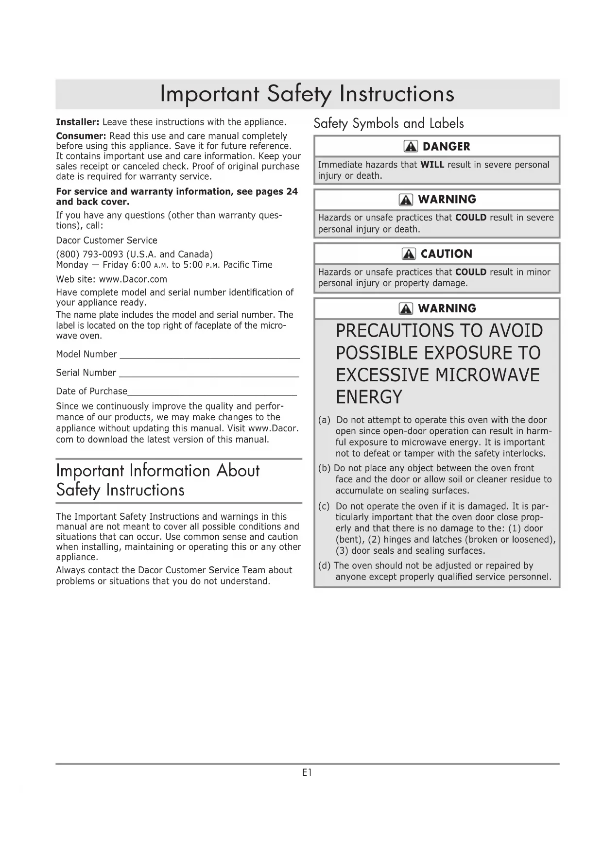 - produCT warranTy E1 Installer: Leave these instructions with the appliance.Consumer: Read this use and care manual completely before using this appliance. Save it for future reference. It contains important use and care information. Keep your sales receipt or canceled check. Proof of original purchase date is required for warranty service.For service and warranty information, see pages 24 and back cover.If you have any questions (other than warranty ques-tions), call:Dacor Customer Service(800) 793-0093 (U.S.A. and Canada) Monday — Friday 6:00 a.m. to 5:00 p.m. Pacic Time Web site: www.Dacor.comHave complete model and serial number identication of your appliance ready. The name plate includes the model and serial number. The label is located on the top right of faceplate of the micro-wave oven. Model Number __________________________________Serial Number __________________________________Date of Purchase________________________________Since we continuously improve the quality and perfor-mance of our products, we may make changes to the appliance without updating this manual. Visit www.Dacor.com to download the latest version of this manual. Important Information About Safety Instructions The Important Safety Instructions and warnings in this manual are not meant to cover all possible conditions and situations that can occur. Use common sense and caution when installing, maintaining or operating this or any other appliance.Always contact the Dacor Customer Service Team about problems or situations that you do not understand. Important Safety Instructions Safety Symbols and Labels DANGER Immediate hazards that WILL result in severe personal injury or death. WARNING Hazards or unsafe practices that COULD result in severe personal injury or death. CAUTION Hazards or unsafe practices that COULD result in minor personal injury or property damage. WARNING p. 24