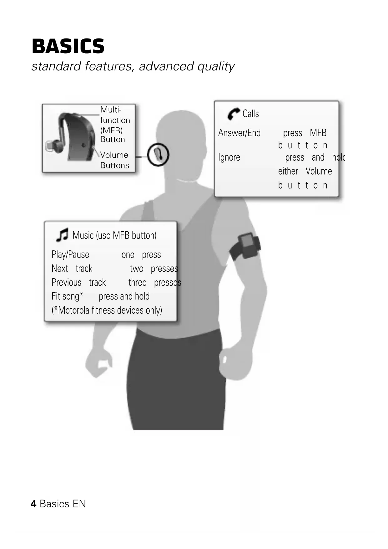 Voice prompt: “ready to pair” Follow voice prompts. Voice prompt: “pairing complete”4 Basics EN Basics standard features, advanced quality Music (use MFB button) Play/Pause one press Next track two presses Previous track three presses Fit song* press and hold (*Motorola fitness devices only) Calls Answer/End press MFB button Ignore press and hold either Volume button Multi- function (MFB) Button Volume Buttons5EN Advanced Advanced more clever stuff Status light An easy way to check your headset. status light headset three blue flashes turning on and off steady blue easy pairing mode rapid blue/purple flashes connecting to your call/music device slow blue flash in standby (wireless connection exists for calls and music only) quick blue flash incoming/outgoing call blue pulse on a call purple pulse music playing slow red flash idle (not connected to a call/music device) quick red flash in a low battery state6 Advanced EN Settings Press and hold the Power and Multifunction buttons together to enter the settings menu, then follow the voice prompts to change them: