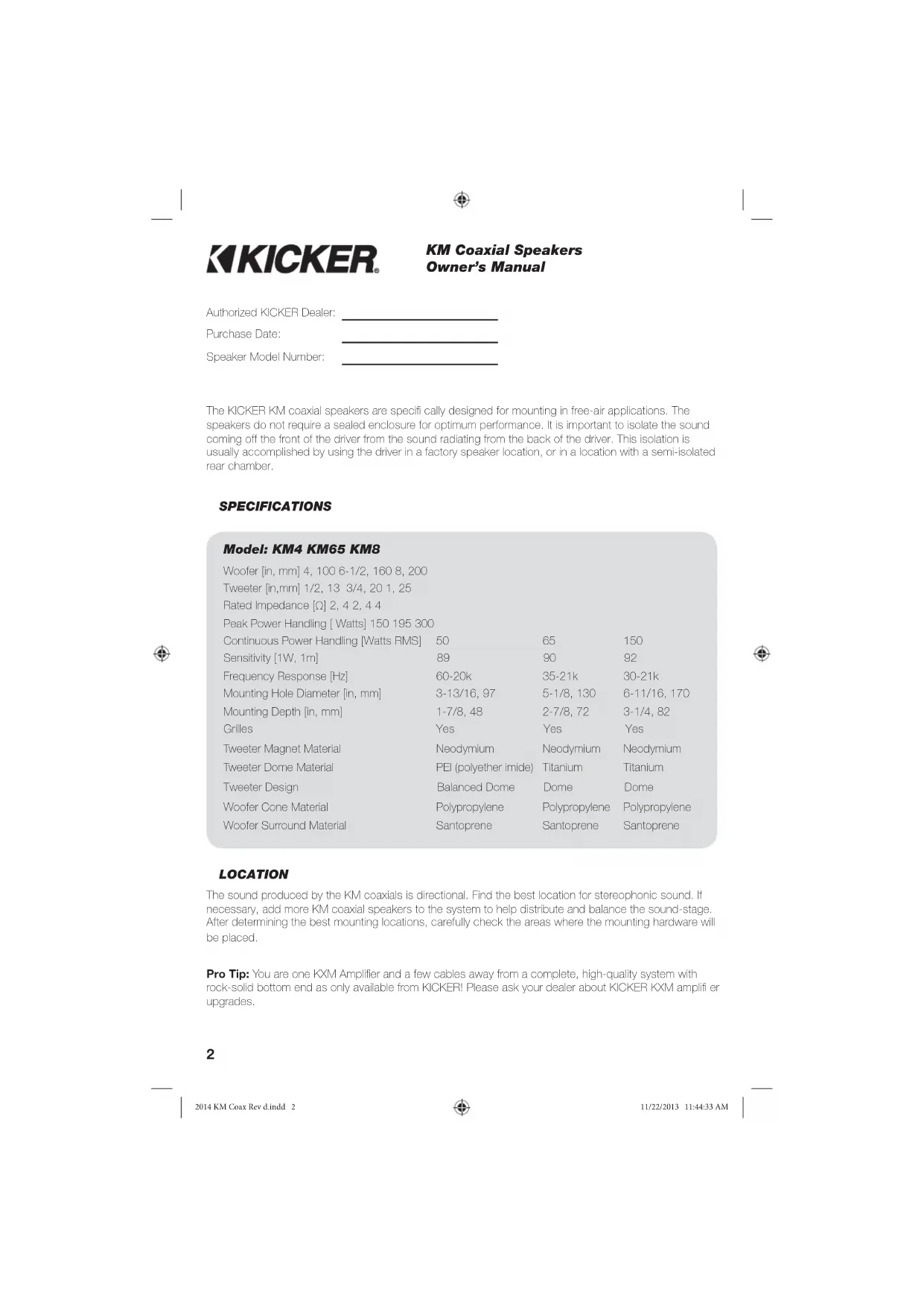 Coaxial Speakers 2014 KM Coax Rev d.indd 12014 KM Coax Rev d.indd 1 11/22/2013 11:44:25 AM11/22/2013 11:44:25 AM2 The KICKER KM coaxial speakers are specifi cally designed for mounting in free-air applications. The speakers do not require a sealed enclosure for optimum performance. It is important to isolate the sound coming off the front of the driver from the sound radiating from the back of the driver. This isolation is usually accomplished by using the driver in a factory speaker location, or in a location with a semi-isolated rear chamber. SPECIFICATIONS Authorized KICKER Dealer: Purchase Date: Speaker Model Number: LOCATION The sound produced by the KM coaxials is directional. Find the best location for stereophonic sound. If necessary, add more KM coaxial speakers to the system to help distribute and balance the sound-stage. After determining the best mounting locations, carefully check the areas where the mounting hardware will be placed. Model: KM4 KM65 KM8 Woofer [in, mm] 4, 100 6-1/2, 160 8, 200 Tweeter [in,mm] 1/2, 13 3/4, 20 1, 25 Rated Impedance [Ω] 2, 4 2, 4 4 Peak Power Handling [ Watts] 150 195 300 Continuous Power Handling [Watts RMS] 50 65 150 Sensitivity [1W, 1m] 89 90 92 Frequency Response [Hz] 60-20k 35-21k 30-21k Mounting Hole Diameter [in, mm] 3-13/16, 97 5-1/8, 130 6-11/16, 170 Mounting Depth [in, mm] 1-7/8, 48 2-7/8, 72 3-1/4, 82 Grilles Yes Yes Yes Tweeter Magnet Material Neodymium Neodymium Neodymium Tweeter Dome Material PEI (polyether imide) Titanium Titanium Tweeter Design Balanced Dome Dome Dome Woofer Cone Material Polypropylene Polypropylene Polypropylene Woofer Surround Material Santoprene Santoprene Santoprene KM Coaxial Speakers Owner’s Manual Pro Tip: You are one KXM Amplifi er and a few cables away from a complete, high-quality system with rock-solid bottom end as only available from KICKER! Please ask your dealer about KICKER KXM amplifi er upgrades. 2014 KM Coax Rev d.indd 22014 KM Coax Rev d.indd 2 11/22/2013 11:44:33 AM11/22/2013 11:44:33 AM3 Mount the speaker and grille right side-up to take advantage of the coaxial system’s integrated moisture draining system. Loops for mounting with Zip Ties Locking Terminal Cover Wire Divider Possible locations for KM Coaxial Speaker Mounting Mounted in the Bow Mounted Mid-Ship Stern Mounted INSTALLATION Mounting: Make sure the stainless steel mounting screws and U-type speed clips will not puncture the fuel cell, wiring, or interfere with any mechanical parts on the underside of the mounting surface. Pre-drill the mounting screw holes using a 7/64” (2.5mm) bit, and attach the KM coaxial speakers to the boat by fastening the supplied stainless steel coarse-threaded screws to the boat’s structure. If applicable, use the enclosed stainless steel U-type speed clips. If the supplied hardware is not applicable to your installation, some other means of securely attaching the speakers to the boat must be used. Wiring: Carefully place the speaker wire in a location that is clear of standing water and moving components of the boat. For reference, the Blue wire is Positive and the Grey wire is Negative. The locking terminal cover with water resistant gasket is removable for wiring installation; it helps prevent terminal corrosion and electrical shorting. Connect the gold-plated male quick-disconnect on the end of the 18 inch (46cm) speaker wire leads coming out of the sealed speaker basket to the wires from your amplifi er or source unit. Place the connected wires into the locking terminal, making sure the divider separates the blue and silver wire quick disconnects, and snap the locking terminal cover into place. Connect the other end of the wire to your amplifi er in accordance with its owner’s manual. Mount the locking terminal cover in a location free and clear of standing water by utilizing the supplied zip ties through the integrated loops in the locking terminal cover. 2014 KM Coax Rev d.indd 32014 KM Coax Rev d.indd 3 11/22/2013 11:44:33 AM11/22/2013 11:44:33 AM4 Note: KICKER Marine speakers meet or exceed industry standards for environmental humidity and corrosion, and for material degradation due to UV exposure. All specifi cations and performance fi gures are subject to change. Please visit www.kicker.com for the most current information. Please E-mail support@kicker.com or call Technical Services at (405) 624-8583 for specifi c or unanswered questions. Color Combinations: Splice and combine the ground wires to yield a different color. Red Red Green Green Blue Blue Red/Green Lime Green Red/Blue Magenta Blue/Green Aquamarine Red/Green/Blue Blue-White LED Wiring (KM654LCW/KM84LCW only): When hard-wiring the RGB lighting, the black lead is +12V and the red, green, and blue leads are ground. There are seven colors available, depending on your wiring confi guration. KICKER recommends using the KMLC lighting controller (sold separately) for more colors, patterns, and special effects.