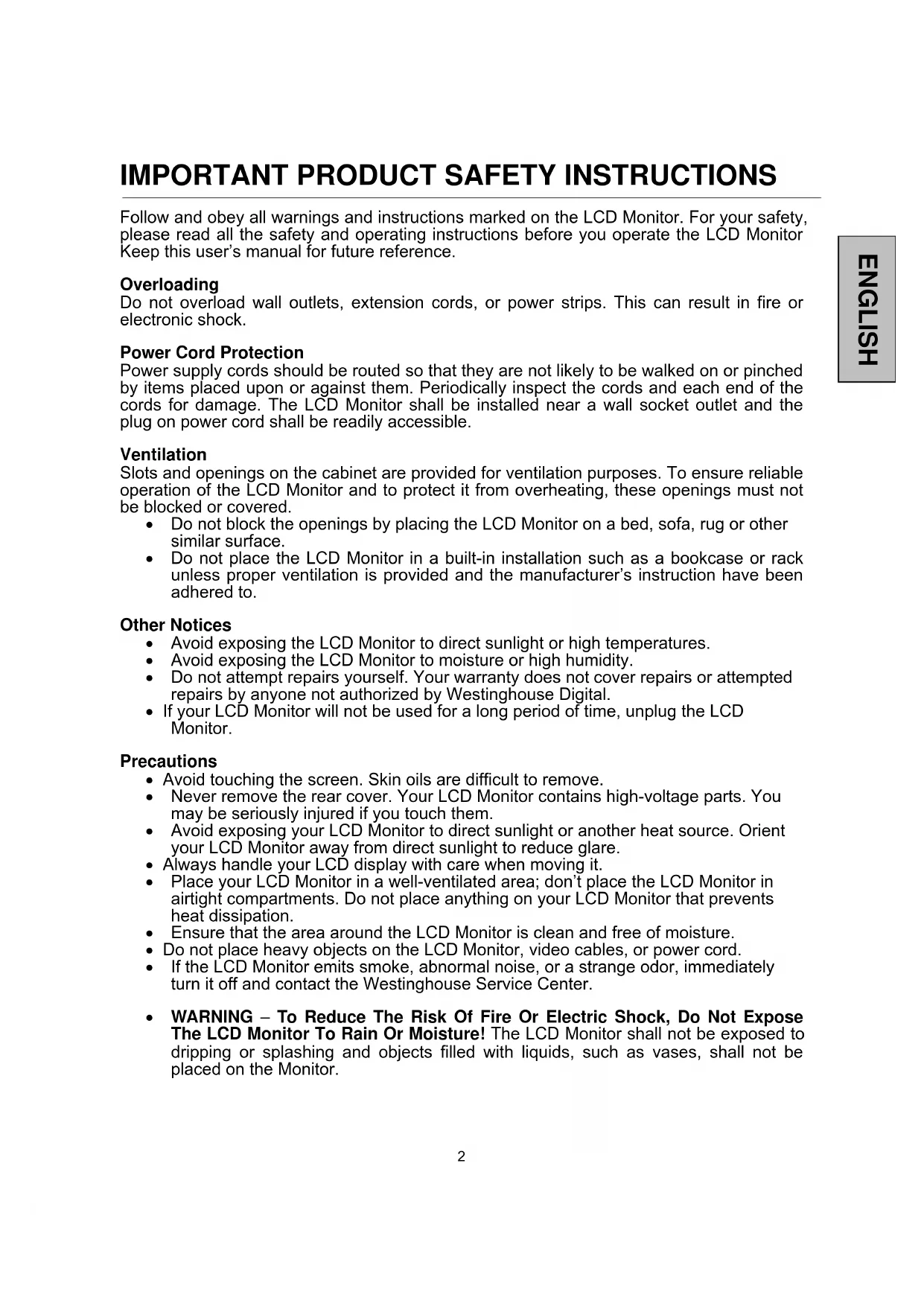 abrasive detergent onto a clean, soft, lint-free cloth, then wipe the surface. Disclaimer Westinghouse Digital does not recommend the use of any ammonia or alcohol-based cleaners on the LCD Monitor screen or case. Some chemical cleaners have been reported to damage the screen and/or LCD Monitor case. Westinghouse Digital will not be liable for damage resulting from the use of any ammonia or alcohol-based cleaners.ENGLISH