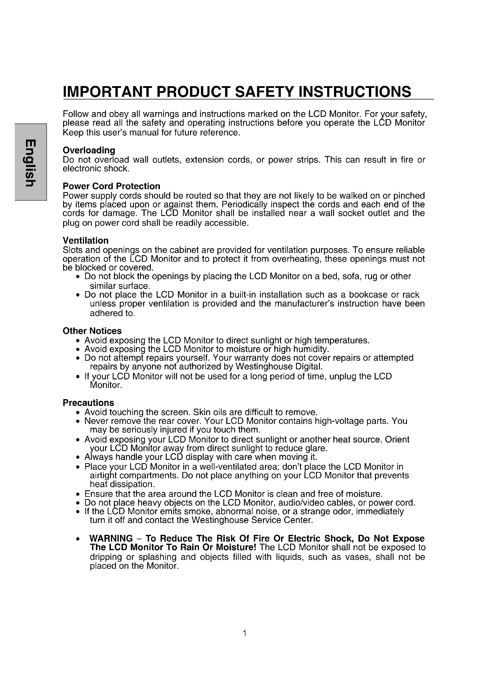 Download the instructions for your Monitor in PDF format for free! Find your manual L1928NV - WESTINGHOUSE and take your electronic device back in hand. On this page are published all the documents necessary for the use of your device. L1928NV by WESTINGHOUSE.
