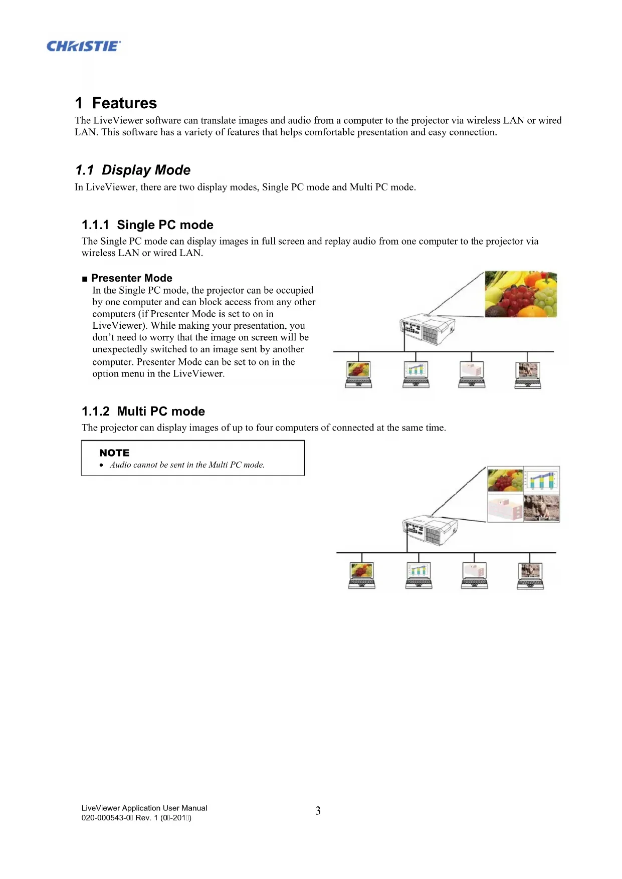 - Caution The Software is being delivered to you “AS IS” and Christie Digital Systems USA, Inc. (CHRISTIE) make no warranty as to its use or performance. CHRISTIE AND ITS SUPPLIERS, INCLUDING BUT NOT LIMITED TO CHRISTIE, DO NOT AND CANNOT WARRANT THE PERFORMANCE OR RESULTS YOU MAY OBTAIN BY USING THE SOFTWARE. EXCEPT TO THE EXTENT PROHIBITED BY LAW IN YOUR JURISDICTION, CHRISTIE AND ITS SUPPLIERS MAKE NO WARRANTIES CONDITIONS, REPRESENTATIONS, OR TERMS (EXPRESS OR IMPLIED WHETHER BY STATUTE, COMMON LAW, CUSTOM, USAGE OR OTHERWISE) AS TO ANY MATTER IN CONNECTION WITH THE SOFTWARE, INCLUDING WITHOUT LIMITATION NONINFRINGEMENT OF THIRD PARTY RIGHTS, MERCHANTABILITY, INTEGRATION, SATISFACTORY QUALITY, OR FITNESS FOR ANY PARTICULAR PURPOSE. You agree that the Software will not be shipped, transferred or exported into any country or used in any manner prohibited by the United States Export Administration Act or any other applicable export laws, restrictions or regulations (collectively the “Export Laws”). In addition, if the Software is identified as export controlled items under the Export Laws, you represent and warrant that you are not a citizen, or otherwise located within, an embargoed nation (including without limitation Iran, Iraq, Syria, Sudan, Libya, Cuba, North Korea, and Serbia) and that you are not otherwise prohibited under the Export Laws from receiving the Software. All rights to Use the Software are granted on condition that such rights are forfeited if you fail to comply with the terms of this Agreement. LiveViewer Application User Manual 020-000543-0 Rev. 1 (0-201)2 Contents 1 Features p. 3