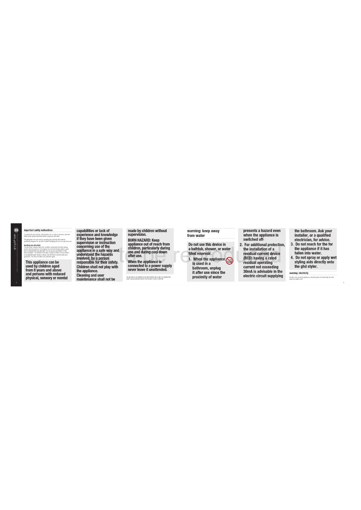 important safety instructions To reduce the risk of burns, electrocution, re, or injury to persons, read and follow these safety instructions before using your ghd styler.This ghd styler is for use only as a airstyling aid, and only with products specically designed for use with a heated hairstyling aid such as a ghd heat mat.Handling your ghd stylerThe ghd styler contains high-tech, sensitive components therefore please ensure that the product is not dropped. Do not insert foreign objects, paint, burn or disassemble your ghd styler. Do not use your ghd styler if it has been damaged – for example if the styler casing is cracked. If your product is damaged through misuse or abuse, this will not be covered under your guarantee. This does not aect your statutory rights. This appliance can be used by children aged from 8 years and above and persons with reduced physical, sensory or mental capabilities or lack of experience and knowledge if they have been given supervision or instruction concerning use of the appliance in a safe way and understand the hazards involved, by a person responsible for their safety. Children shall not play with the appliance. Cleaning and user maintenance shall not be made by children without supervision. BURN HAZARD: Keep appliance out of reach from children, particularly during use and during cool down after use. When the appliance is connected to a power supply never leave it unattended. The ghd styler is not suitable for use with synthetic hair or wigs. It is possible that colour may permanently transfer onto the styler if used on dyed hair.