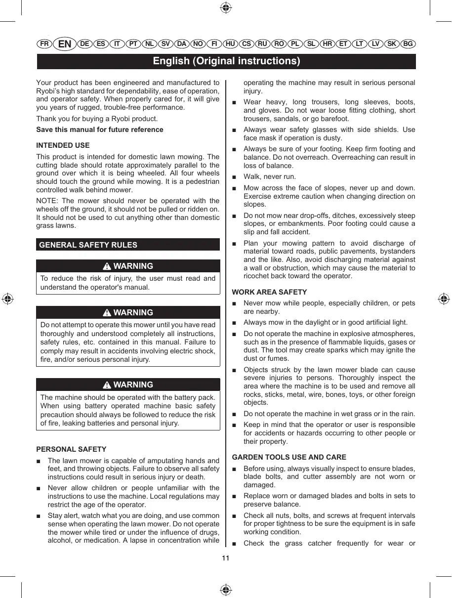 Plan your mowing pattern to avoid discharge of material toward roads, public pavements, bystanders and the like. Also, avoid discharging material against a wall or obstruction, which may cause the material to ricochet back toward the operator. Thank you for buying a Ryobi product. This product is intended for domestic lawn mowing. The cutting blade should rotate approximately parallel to the ground over which it is being wheeled. All four wheels should touch the ground while mowing. It is a pedestrian controlled walk behind mower. NOTE: The mower should never be operated with the wheels off the ground, it should not be pulled or ridden on. It should not be used to cut anything other than domestic grass lawns. WARNING To reduce the risk of injury, the user must read and understand the operator's manual.