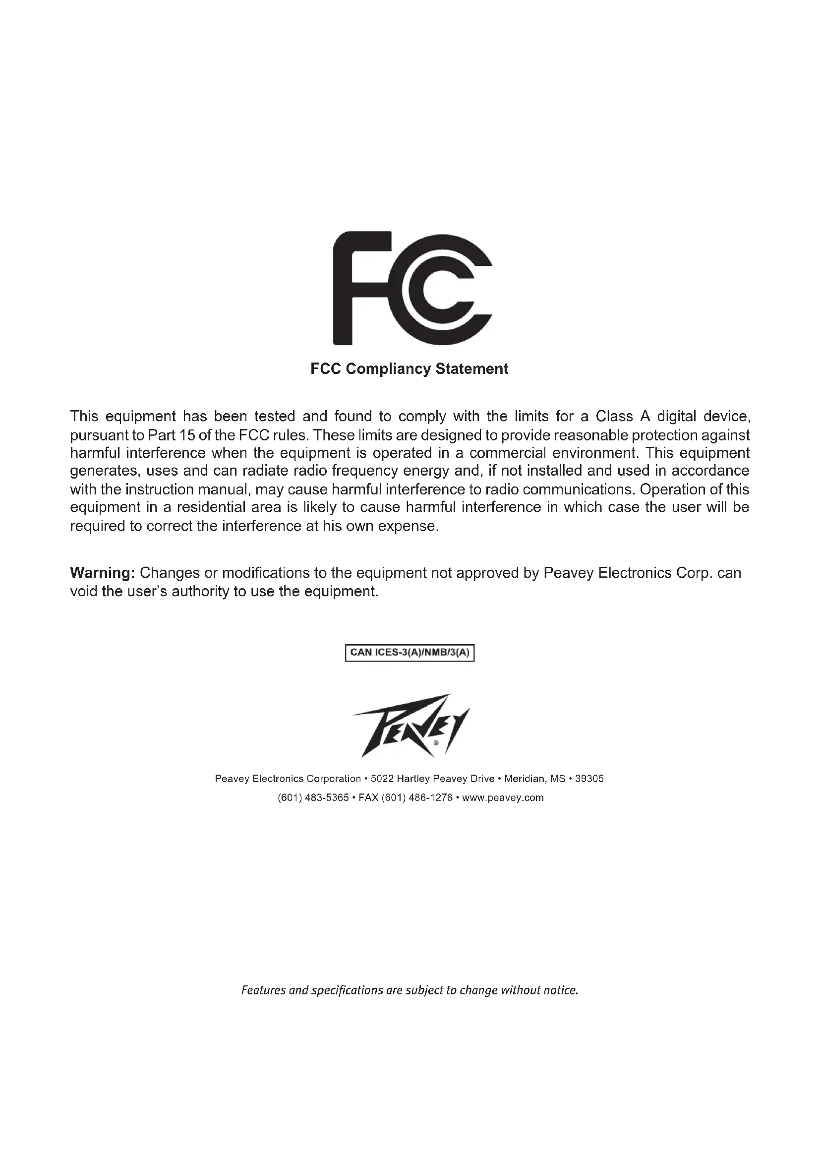 Warning: Changes or modications to the equipment not approved by Peavey Electronics Corp. can
