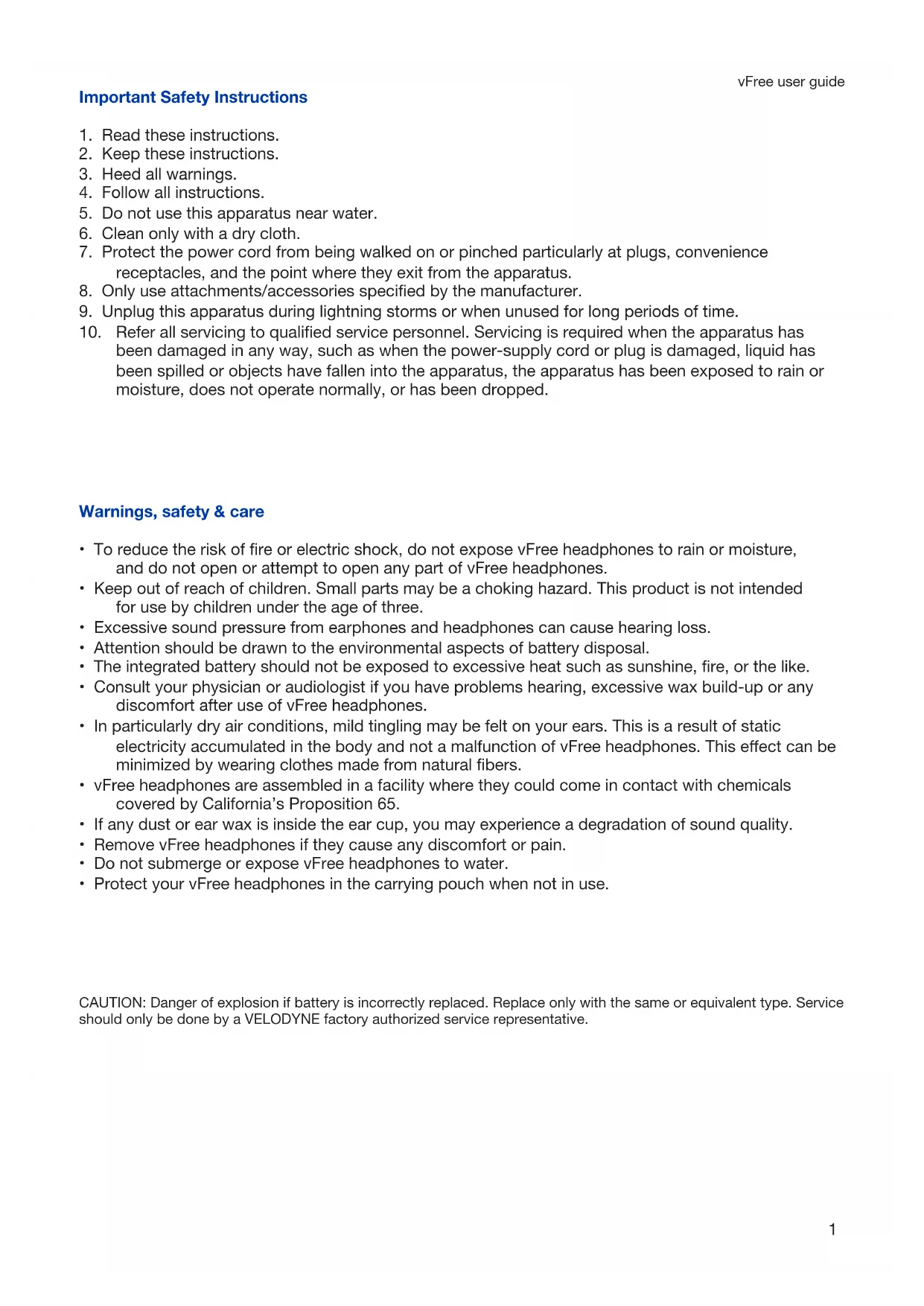 - Protect your vFree headphones in the carrying pouch when not in use. CAUTION: Danger of explosion if battery is incorrectly replaced. Replace only with the same or equivalent type. Service should only be done by a VELODYNE factory authorized service representative. vFree user guide 1Sound Noise Level (dB) Eect Normal breathing 10 Just audible Whisper 30 Very quiet Normal conversation 50-65 Comfortable hearing levels are under 60 dB Vacuum cleaner, hair dryer 70 Intrusive; interferes with telephone conversation Average city trac 80 Annoying; interferes with conversation; constant exposure may cause damage Lawnmower, food blender 85-90 85 dB is the level at which hearing damage (8 hrs) begins Garbage truck, cement mixer 100 No more than 15 minutes of unprotected exposure recommended for sounds between 90-100 dB Stereos (over 100 watts), thunderclap (near) 110-125 Regular exposure to sound over 100 dB of more than one minute risks permanent hearing loss Jet engines (near) 140 Threshold of pain begins around 125 dB *Information obtained from http://www.nidcd.nih.gov/health/education/teachers/pages/common_sounds.aspx Please listen safely For trac safety, do not use vFree headphones while driving or cycling. Do not wear vFree headphones while operating machinery. Adhere to local laws regarding the use of headphones. Listening with vFree headphones at high volumes may aect your hearing, including causing permanent damage. Ringing in your ears or other discomfort can indicate that the volume is too high. Hearing health is critical to enjoyment and the quality of life. Protect your hearing by listening with your vFree headphones in a responsible manner that protects your long term hearing health. Velodyne Acoustics, Inc. is not responsible for hearing loss or damage resulting from the use of this product. Cleaning Ear cups should be cleaned regularly for sanitary reasons and to prolong the life of your ear cups. With a dry cloth or paper towel, thoroughly clean the ear cups. Do not get the speakers or electronics inside of your headphones wet. Liquids and heavy moisture can cause damage to the electronics inside your headphones. Such accidental damages are not covered under warranty.