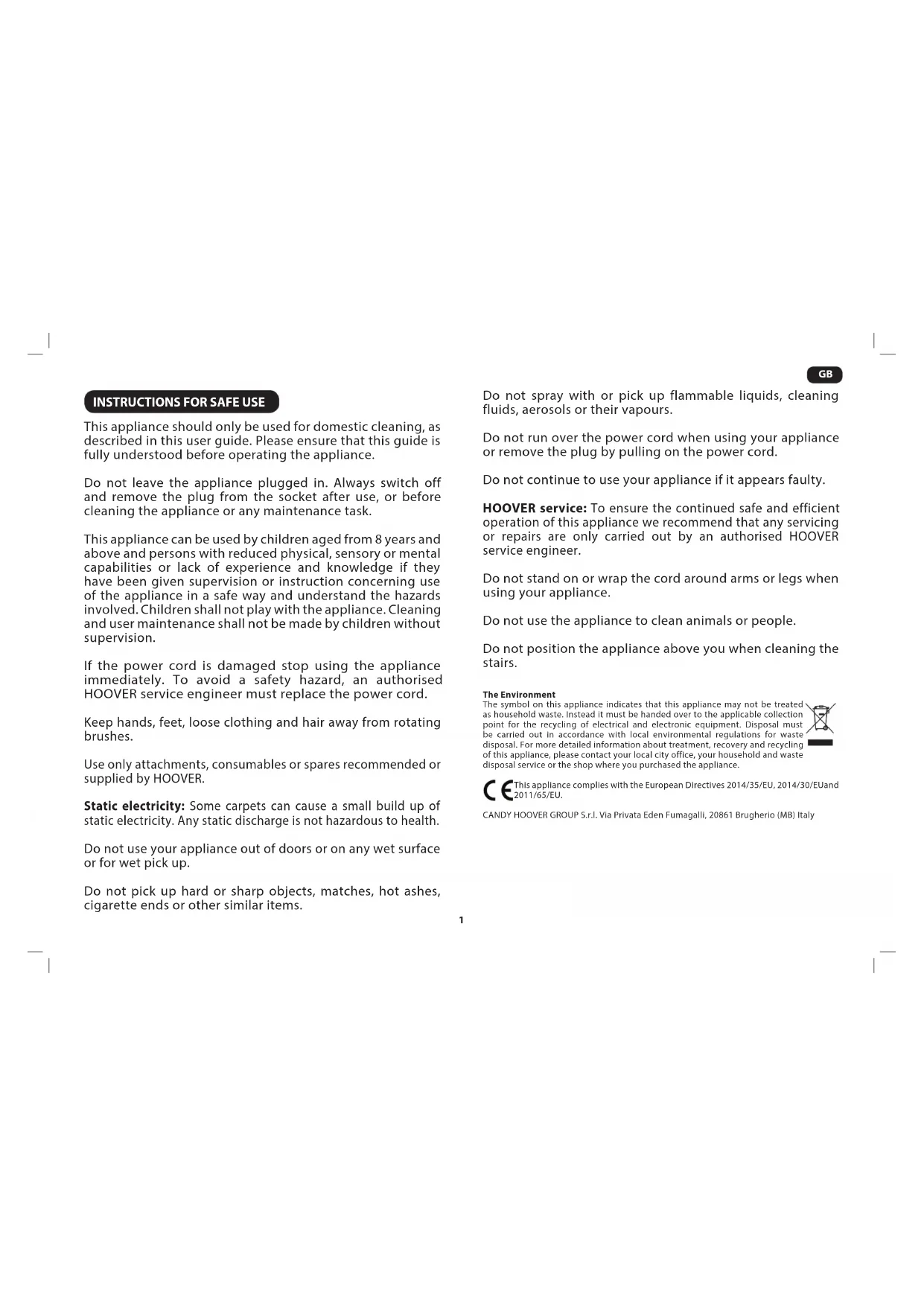 cINSTRUCTIONS FOR SAFE USE This appliance should only be used for domestic cleaning, as described in this user guide. Please ensure that this guide is fully understood before operating the appliance. Do not leave the appliance plugged in. Always switch off and remove the plug from the socket after use, or before cleaning the appliance or any maintenance task. This appliance can be used by children aged from 8 years and above and persons with reduced physical, sensory or mental capabilities or lack of experience and knowledge if they have been given supervision or instruction concerning use of the appliance in a safe way and understand the hazards involved. Children shall not play with the appliance. Cleaning and user maintenance shall not be made by children without supervision. If the power cord is damaged stop using the appliance immediately. To avoid a safety hazard, an authorised HOOVER service engineer must replace the power cord. Keep hands, feet, loose clothing and hair away from rotating brushes. Use only attachments, consumables or spares recommended or supplied by HOOVER. Static electricity: Some carpets can cause a small build up of static electricity. Any static discharge is not hazardous to health. Do not use your appliance out of doors or on any wet surface or for wet pick up. Do not pick up hard or sharp objects, matches, hot ashes, cigarette ends or other similar items. Do not spray with or pick up flammable liquids, cleaning fluids, aerosols or their vapours. Do not run over the power cord when using your appliance or remove the plug by pulling on the power cord. Do not continue to use your appliance if it appears faulty. HOOVER service: To ensure the continued safe and efficient operation of this appliance we recommend that any servicing or repairs are only carried out by an authorised HOOVER service engineer. Do not stand on or wrap the cord around arms or legs when using your appliance. Do not use the appliance to clean animals or people. Do not position the appliance above you when cleaning the stairs. The Environment The symbol on this appliance indicates that this appliance may not be treated as household waste. Instead it must be handed over to the applicable collection point for the recycling of electrical and electronic equipment. Disposal must be carried out in accordance with local environmental regulations for waste disposal. For more detailed information about treatment, recovery and recycling of this appliance, please contact your local city office, your household and waste disposal service or the shop where you purchased the appliance. This appliance complies with the European Directives 2014/35/EU, 2014/30/EUand 2011/65/EU. CANDY HOOVER GROUP S.r.l. Via Privata Eden Fumagalli, 20861 Brugherio (MB) Italy