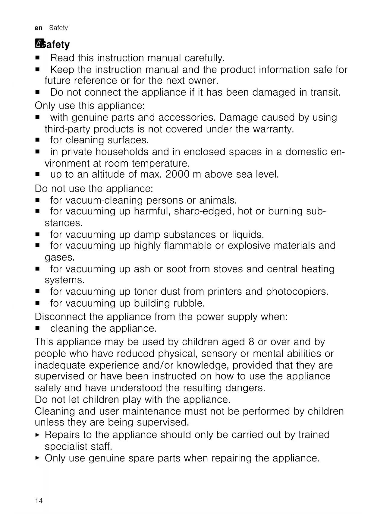 Page17 Only use the appliance in enclosed spaces. Never expose the appliance to intense heat or humidity. Do not use steam- or high-pressure cleaners to clean the appli- ance. Never let the power cord come into contact with hot appliance parts or heat sources. Never let the power cord come into contact with sharp points or edges. Never kink, crush or modify the power cord. Connect and operate the appliance only in accordance with the specifications on the rating plate. Connect the appliance to a power supply with alternating current only via a properly installed socket with earthing. The protective conductor system of the domestic electrical in- stallation must be properly installed. Do not apply flammable substances or substances containing al- cohol to the filter. When cleaning the appliance, do not use flammable substances or substances that contain alcohol. Pull out the power cord completely. Keep clothing, hair, fingers and other body parts away from the openings on the appliance and the moving parts. Never point the pipe or the nozzles towards eyes, hair, ears or mouths. When vacuuming stairs, ensure that there are no persons under- neath the appliance. When taking a break from vacuuming, switch off the appliance and pull out the mains plug. Retract the power cord. 15en Preventing material damage When the cord is being rewound automatically, ensure that the mains plug is not thrown in the direction of persons, body parts, animals or objects. Keep packaging material away from children. Do not let children play with packaging material. Preventing material damagePreventing material damage Never place the appliance on the hose. Regularly check the running surfaces of the nozzles for wear. Replace worn nozzles. Never operate the appliance without the motor protection filter. Never operate the appliance without the exhaust filter. OverviewOverview You can find an overview of the parts of your appliance here. Note: Individual details and colours may dif- fer, depending on the appliance model. Fig.