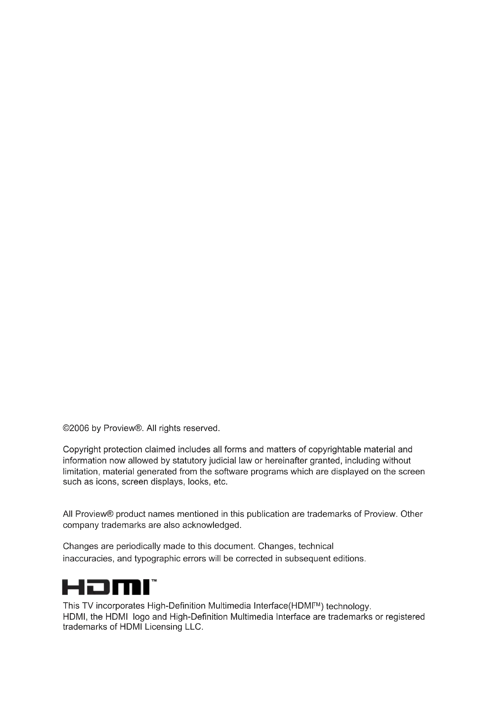 ©2006 by Proview®. All rights reserved. Copyright protection claimed includes all forms and matters of copyrightable material and information now allowed by statutory judicial law or hereinafter granted, including without limitation, material generated from the software programs which are displayed on the screen such as icons, screen displays, looks, etc. All Proview® product names mentioned in this publication are trademarks of Proview. Other company trademarks are also acknowledged. Changes are periodically made to this document. Changes, technical inaccuracies, and typographic errors will be corrected in subsequent editions. This TV incorporates High-Definition Multimedia Interface(HDMI