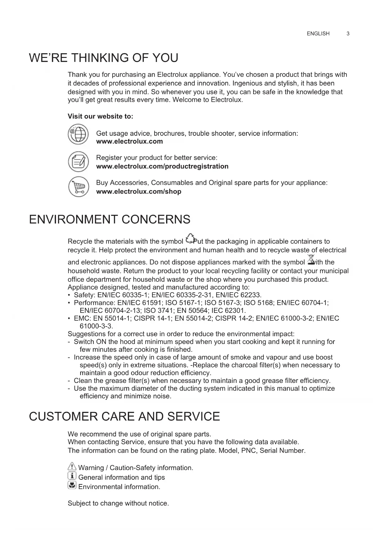 We recommend the use of original spare parts. When contacting Service, ensure that you have the following data available. The information can be found on the rating plate. Model, PNC, Serial Number. Warning / Caution-Safety information. General information and tips Environmental information. Subject to change without notice. EN USER MANUALwww.electrolux.com