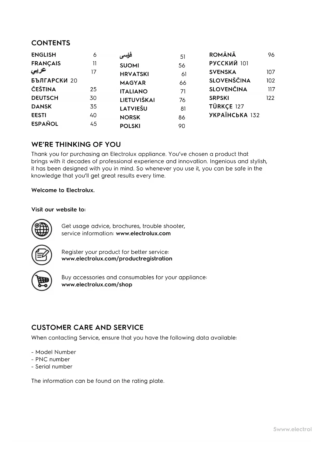 12115www.electrolux.com Visit our website to: Get usage advice, brochures, trouble shooter, service information: www.electrolux.com Register your product for better service: www.electrolux.com/productregistration Buy accessories and consumables for your appliance: www.electrolux.com/shop CONTENTS ENGLISH 6 FRANÇAIS 11