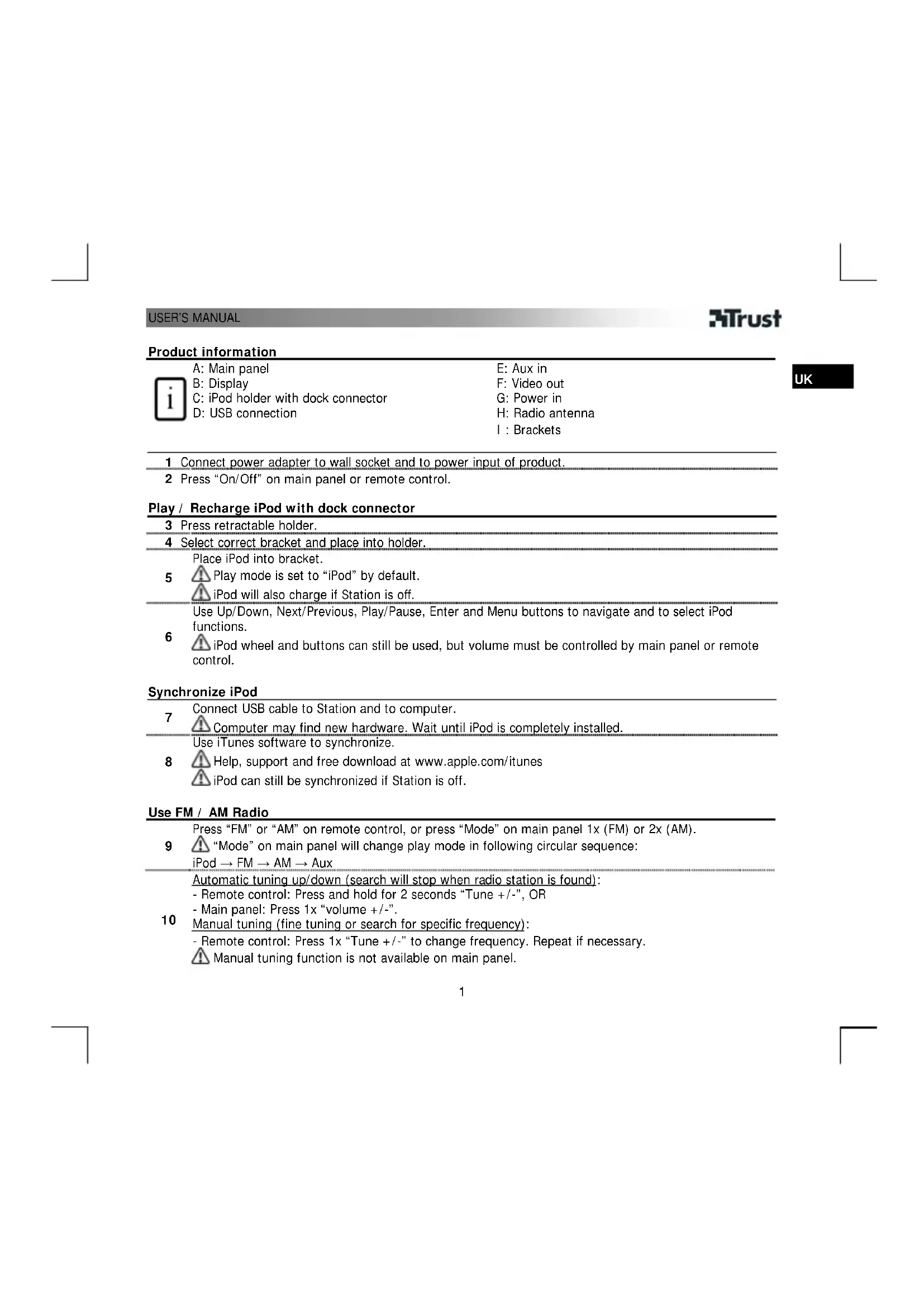 - Video output is only available if iPod model has video output (check iPod specifications), and if the dock connector is used. See www.trust.com/15133 for up-to-date FAQs, drivers and instruction manuals. For extensive service, register at www.trust.com/register. Energy
