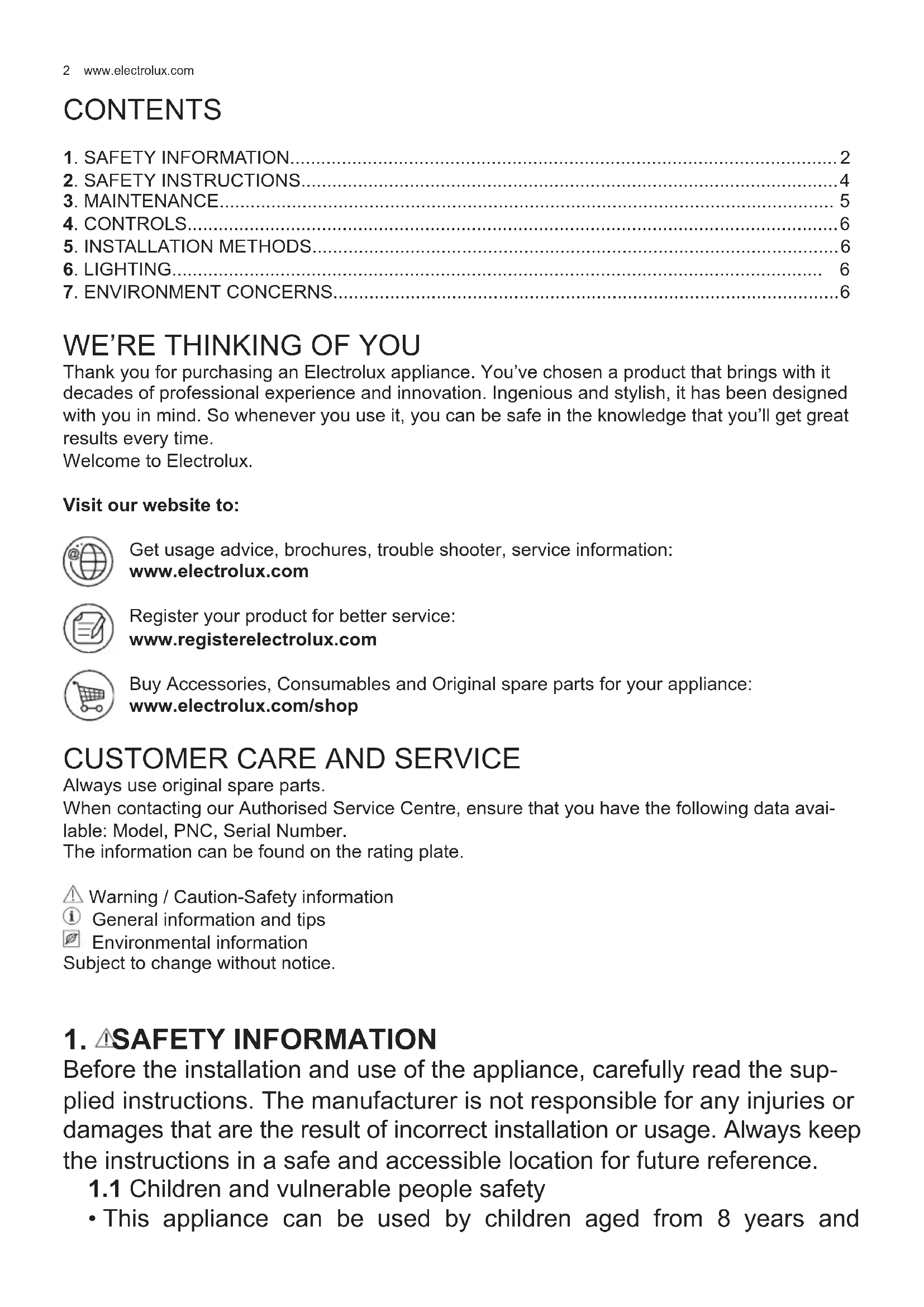 Thank you for purchasing an Electrolux appliance. You’ve chosen a product that brings with it decades of professional experience and innovation. Ingenious and stylish, it has been designed with you in mind. So whenever you use it, you can be safe in the knowledge that you’ll get great results every time. Welcome to Electrolux. Visit our website to: Get usage advice, brochures, trouble shooter, service information: www.electrolux.com Register your product for better service: www.registerelectrolux.com Buy Accessories, Consumables and Original spare parts for your appliance: www.electrolux.com/shop