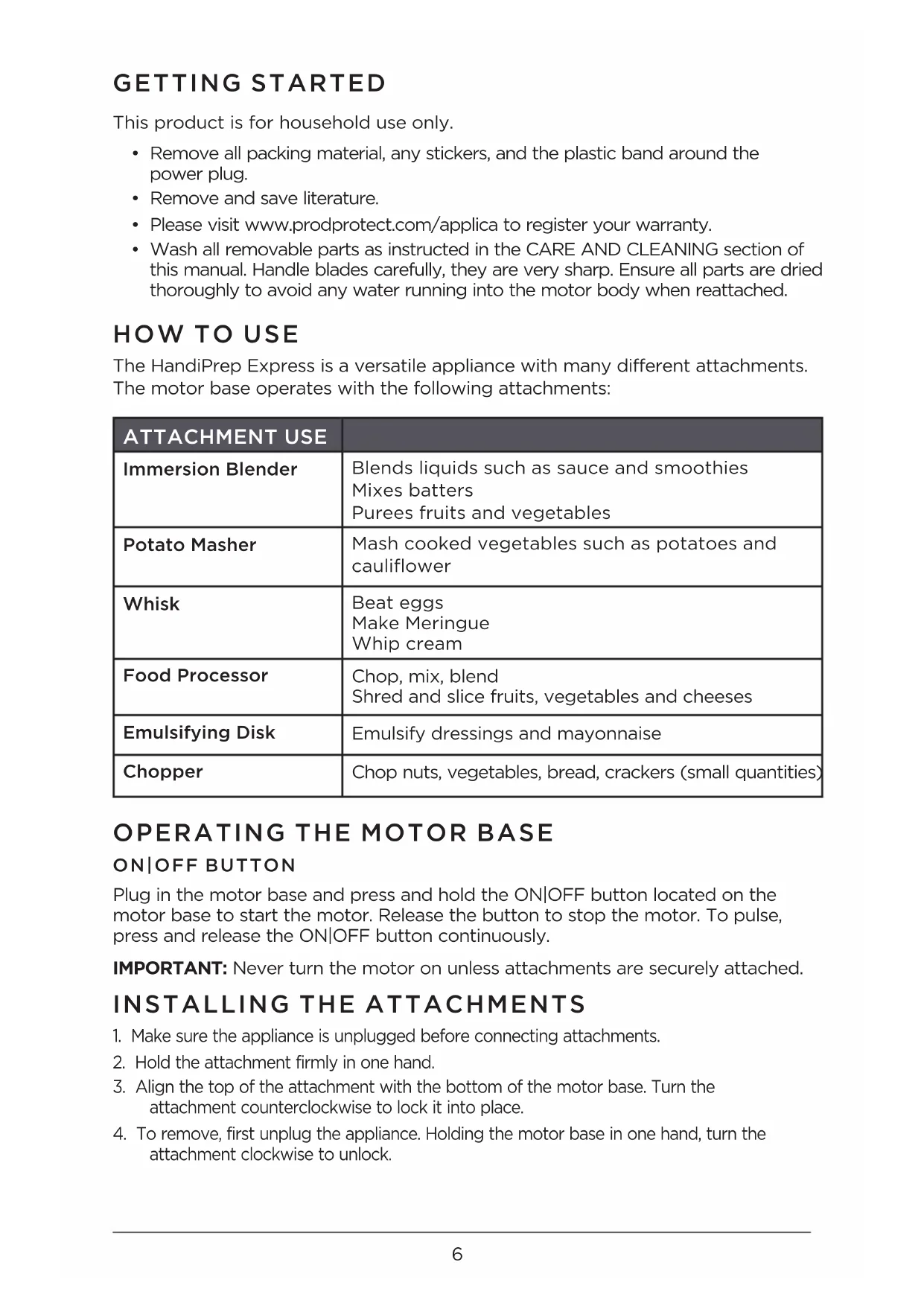 attachment clockwise to unlock. ATTACHMENT USE Immersion Blender Blends liquids such as sauce and smoothies Mixes batters Purees fruits and vegetables Potato Masher Mash cooked vegetables such as potatoes and cauliflower Whisk Beat eggs Make Meringue Whip cream Food Processor Chop, mix, blend Shred and slice fruits, vegetables and cheeses Emulsifying Disk Emulsify dressings and mayonnaise Chopper Chop nuts, vegetables, bread, crackers (small quantities) GETTING STARTED This product is for household use only.