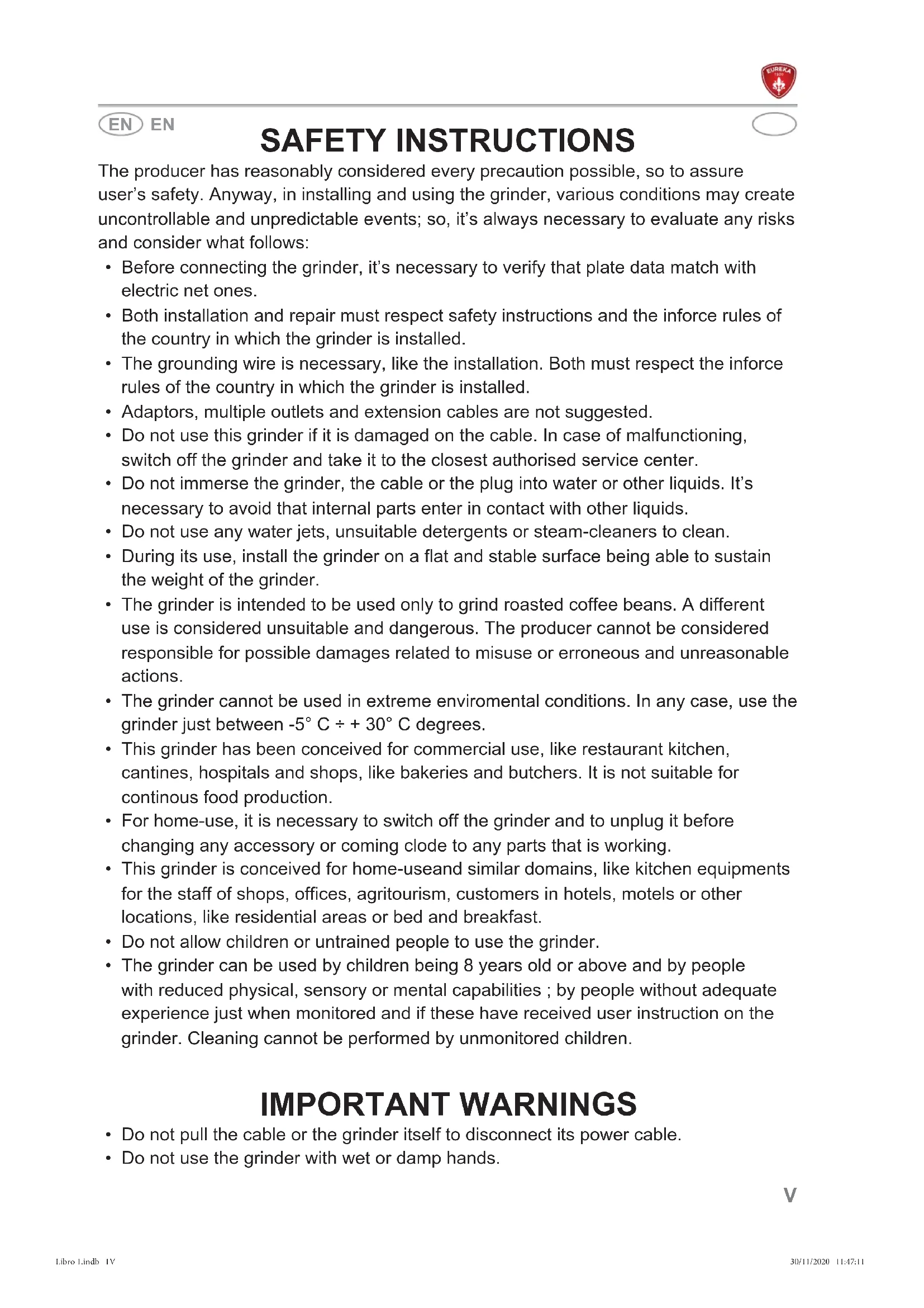 - Do not use the grinder with wet or damp hands. Libro 1.indb 1VLibro 1.indb 1V 30/11/2020 11:47:1130/11/2020 11:47:11VI