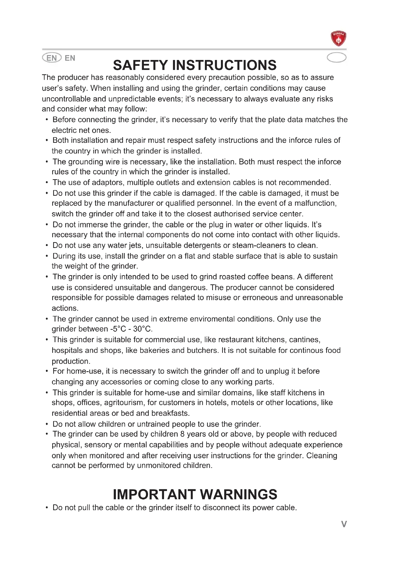 This manual is addressed to the user of the grinder and it is considered part of this product. It shares information on its correct use and maintenance , including information on user’s safety. This manual must be kept throughout the grinder’s lifespan and must be given to any user or future owner. All information in this manual does not replace safety rules and technical data on the installation and functioning of the grinder and its packaging. This manual reflects the current product and cannot be considered inadequate in the event that the product is revised based on new technology. The producer may modify the manual without revising previous editions, except in special cases. A misuse of the grinder, or a different use than the one described on the manual, will invalidate any warranty or responsibility of the producer. The grinder can be used only by a responsible adult. It’s necessary to preserve the manual, as the producer cannot be held responsible for any damage to people or objects, or any damage to the grinder if it is misused or in the event that safety and maintenance rules are not respected.VIII DE DE WARNUNGEN UND SICHERHEITSVORKEHRUNGEN Der Hersteller hat jede erdenkliche Sicherheit vorausgesehen, um die Sicherheit der Benutzer zu gewährleisten, aber die verschiedenen Installations- und/oder Handhabungsbedingungen können unkontrollierbare oder unvorhersehbare Situationen schaffen; daher ist es notwendig, immer alle Restrisiken zu bewerten und die folgenden Vorschläge zu berücksichtigen: