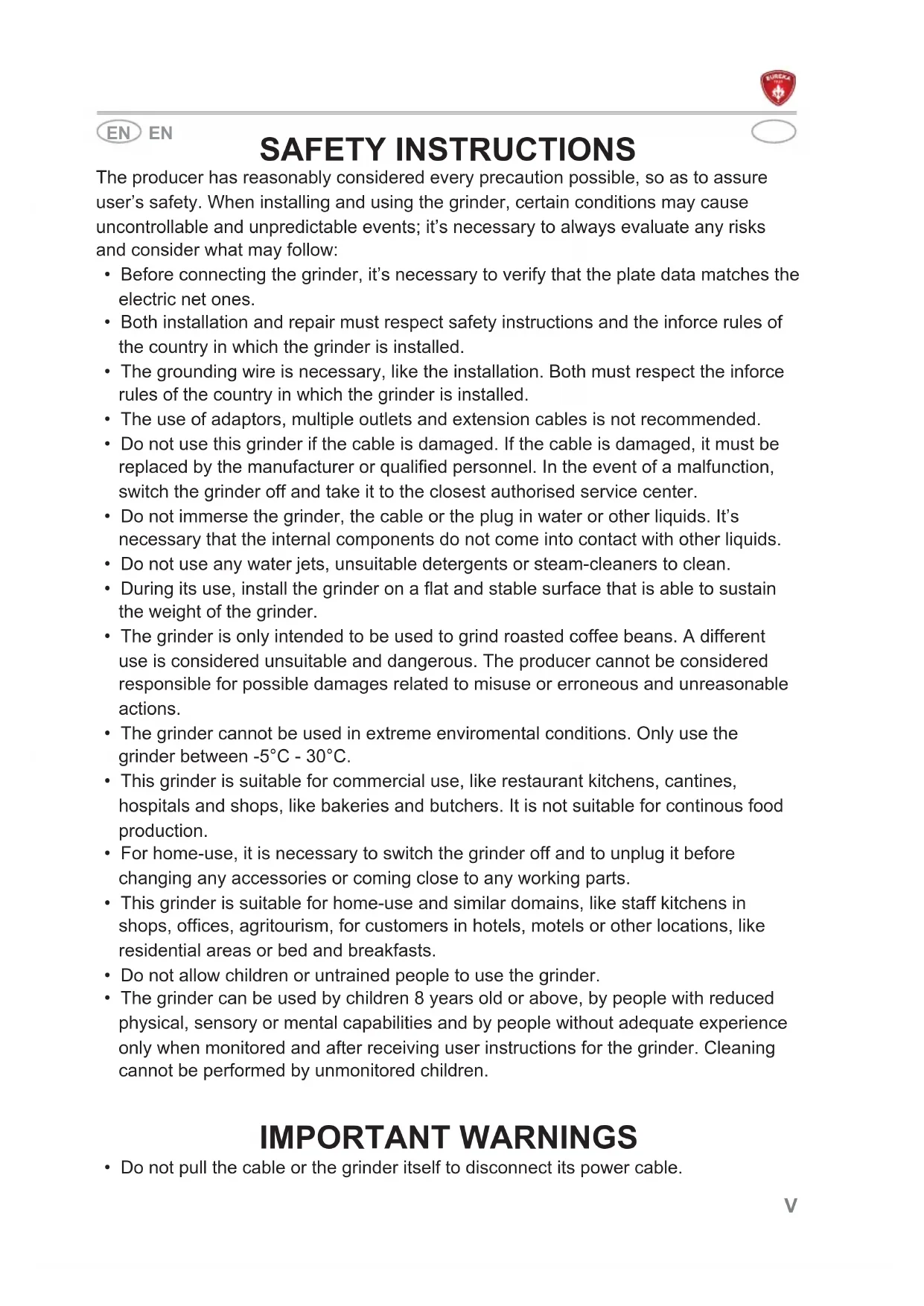 This manual is addressed to the user of the grinder and it is considered part of this product. It shares information on its correct use and maintenance , including information on user’s safety. This manual must be kept throughout the grinder’s lifespan and must be given to any user or future owner. All information in this manual does not replace safety rules and technical data on the installation and functioning of the grinder and its packaging. This manual reflects the current product and cannot be considered inadequate in the event that the product is revised based on new technology. The producer may modify the manual without revising previous editions, except in special cases. A misuse of the grinder, or a different use than the one described on the manual, will invalidate any warranty or responsibility of the producer. The grinder can be used only by a responsible adult. It’s necessary to preserve the manual, as the producer cannot be held responsible for any damage to people or objects, or any damage to the grinder if it is misused or in the event that safety and maintenance rules are not respected.VIII DE DE WARNUNGEN UND SICHERHEITSVORKEHRUNGEN Der Hersteller hat jede erdenkliche Sicherheit vorausgesehen, um die Sicherheit der Benutzer zu gewährleisten, aber die verschiedenen Installations- und/oder Handhabungsbedingungen können unkontrollierbare oder unvorhersehbare Situationen schaffen; daher ist es notwendig, immer alle Restrisiken zu bewerten und die folgenden Vorschläge zu berücksichtigen: