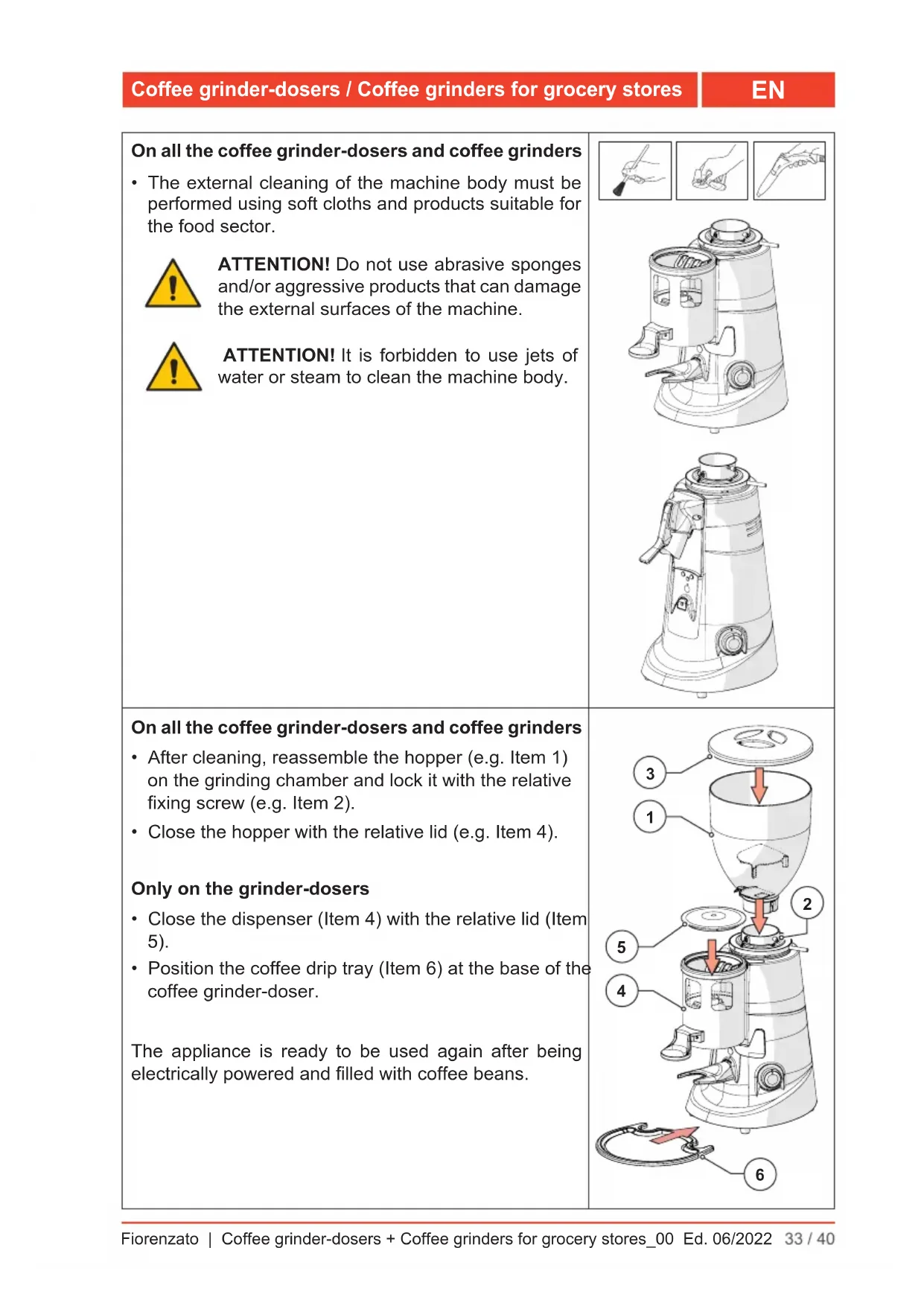 - The external cleaning of the machine body must be performed using soft cloths and products suitable for the food sector. ATTENTION! Do not use abrasive sponges and/or aggressive products that can damage the external surfaces of the machine. ATTENTION! It is forbidden to use jets of waterorsteamtocleanthemachinebody. On all the coffee grinder-dosers and coffee grinders