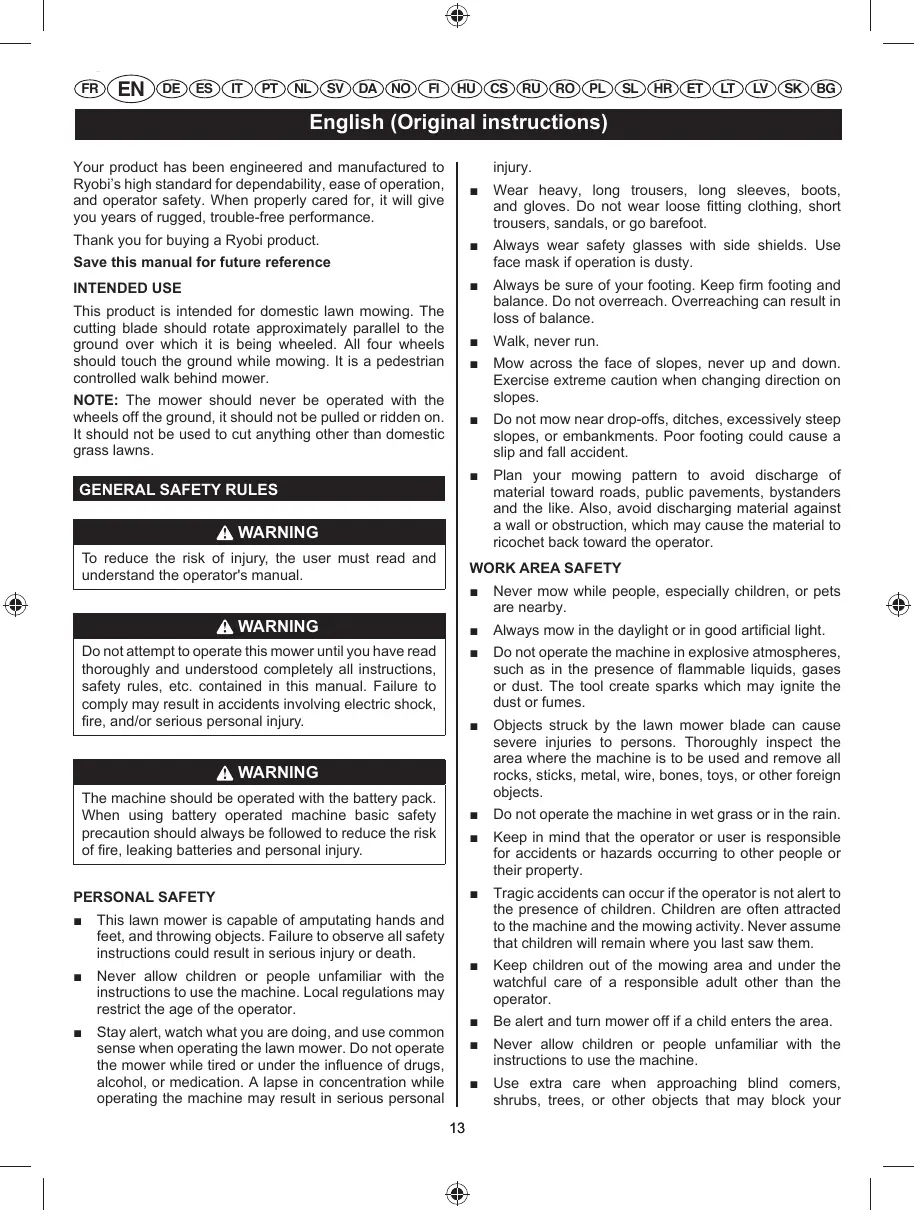 Download the instructions for your Tondeuse à gazon in PDF format for free! Find your manual RLM4852L - RYOBI and take your electronic device back in hand. On this page are published all the documents necessary for the use of your device. RLM4852L by RYOBI.