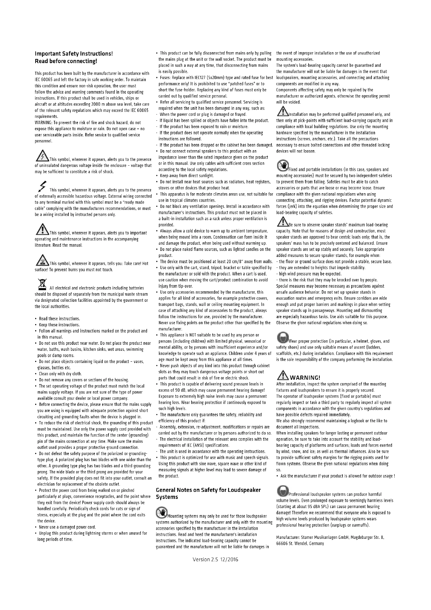 - This product is optimized for use with music and speech signals. Using this product with sine wave, square wave or other kind of measuring signals at higher level may lead to severe damage of the product. General Notes on Safety for Loudspeaker Systems Mounting systems may only be used for those loudspeaker systems authorized by the manufacturer and only with the mounting accessories specified by the manufacturer in the installation instructions. Read and heed the manufacturer’s installation instructions. The indicated load-bearing capacity cannot be guaranteed and the manufacturer will not be liable for damages in the event of improper installation or the use of unauthorized mounting accessories. The system’s load-bearing capacity cannot be guaranteed and the manufacturer will not be liable for damages in the event that loudspeakers, mounting accessories, and connecting and attaching components are modified in any way. Components affecting safety may only be repaired by the manufacturer or authorized agents, otherwise the operating permit will be voided. Installation may be performed qualified personnel only, and then only at pick-points with sufficient load-carrying capacity and in compliance with local building regulations. Use only the mounting hardware specified by the manufacturer in the installation instructions (screws, anchors, etc.). Take all the precautions necessary to ensure bolted connections and other threaded locking devices will not loosen. Fixed and portable installations (in this case, speakers and mounting accessories) must be secured by two independent safeties to prevent them from falling. Safeties must be able to catch accessories or parts that are loose or may become loose. Ensure compliance with the given national regulations when using connecting, attaching, and rigging devices. Factor potential dynamic forces (jerk) into the equation when determining the proper size and load-bearing capacity of safeties. Be sure to observe speaker stands’ maximum load-bearing capacity. Note that for reasons of design and construction, most speaker stands are approved to bear centric loads only; that is, the speakers’ mass has to be precisely centered and balanced. Ensure speaker stands are set up stably and securely. Take appropriate added measures to secure speaker stands, for example when: - the floor or ground surface does not provide a stable, secure base. - they are extended to heights that impede stability. - high wind pressure may be expected. - there is the risk that they may be knocked over by people. Special measures may become necessary as precautions against unsafe audience behavior. Do not set up speaker stands in evacuation routes and emergency exits. Ensure corridors are wide enough and put proper barriers and markings in place when setting speaker stands up in passageways. Mounting and dismounting are especially hazardous tasks. Use aids suitable for this purpose. Observe the given national regulations when doing so. Wear proper protection (in particular, a helmet, gloves, and safety shoes) and use only suitable means of ascent (ladders, scaffolds, etc.) during installation. Compliance with this requirement is the sole responsibility of the company performing the installation. WARNING! After installation, inspect the system comprised of the mounting fixtures and loudspeakers to ensure it is properly secured. The operator of loudspeaker systems (fixed or portable) must regularly inspect or task a third party to regularly inspect all system components in accordance with the given country’s regulations and have possible defects repaired immediately. We also strongly recommend maintaining a logbook or the like to document all inspections. When installing speakers for longer lasting or permanent outdoor operation, be sure to take into account the stability and load- bearing capacity of platforms and surfaces; loads and forces exerted by wind, snow, and ice; as well as thermal influences. Also be sure to provide sufficient safety margins for the rigging points used for flown systems. Observe the given national regulations when doing so.
