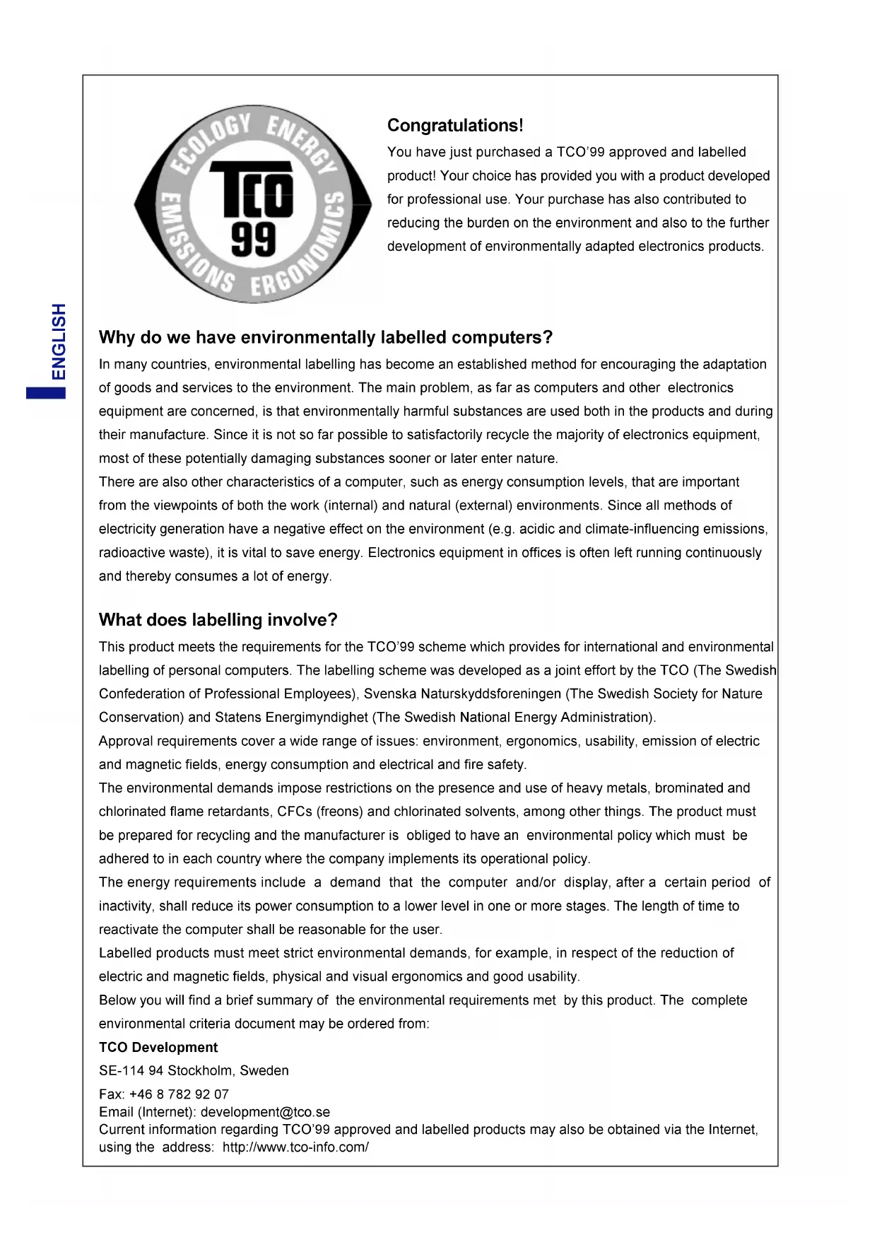 Mercury is sometimes found in batteries, relays and switches. It damages the nervous system and is toxic in high doses. The relevant TCO’99 requirement states that batteries may not contain any mercury. It also demands that mercury is not present in any of the electrical or electronics components associated with the labelled unit. CFCs (freons) The relevant TCO’99 requirement states that neither CFCs nor HCFCs may be used during the manufacture and assembly of the product. CFCs (freons) are sometimes used for washing printed circuit boards. CFCs break down ozone and thereby damage the ozone layer in the stratosphere, causing increased reception on earth of ultraviolet light with e.g. increased risks of skin cancer (malignant melanoma) as a consequence. Lead