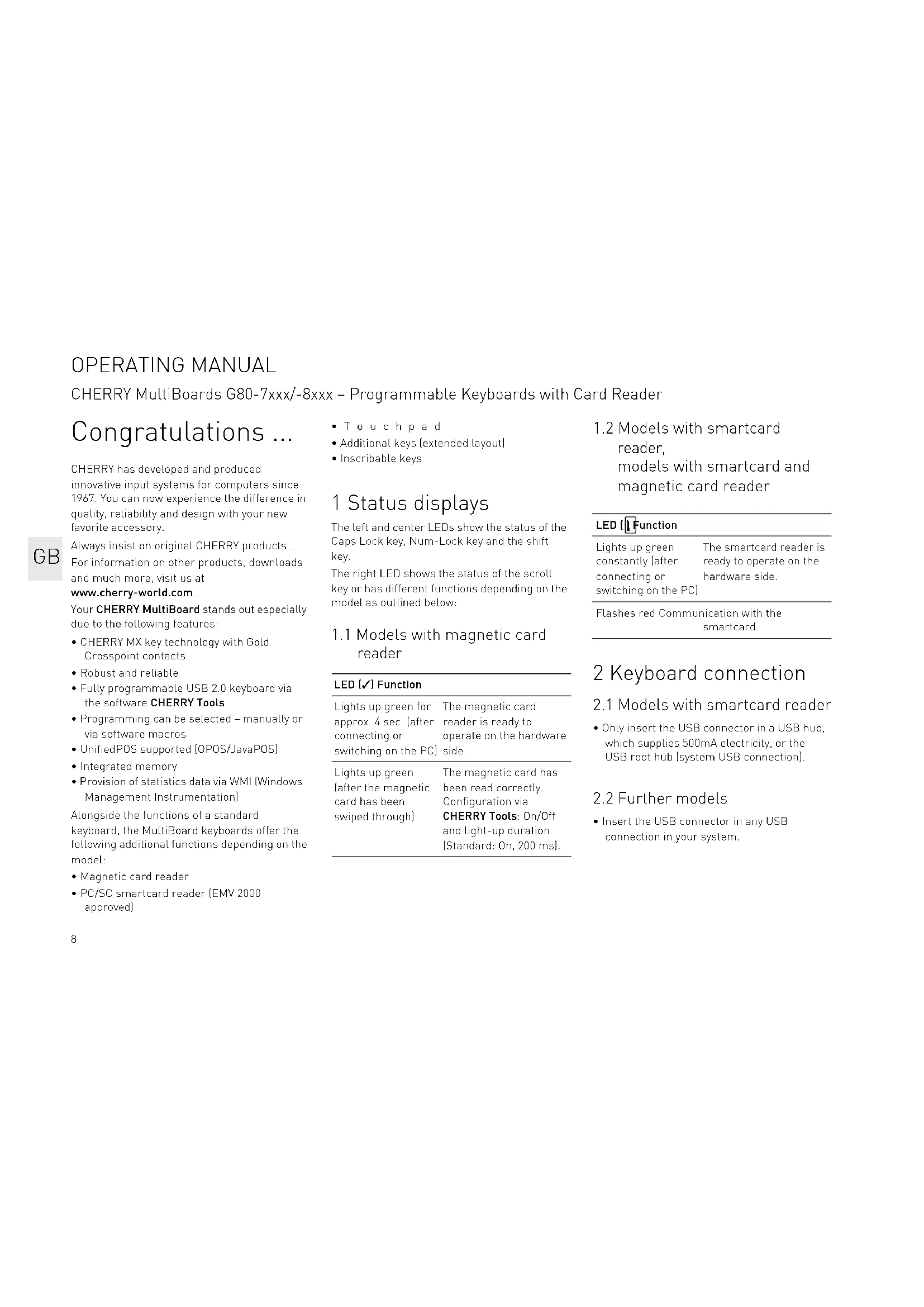 OPERATING MANUAL CHERRY MultiBoards G80-7xxx/-8xxx – Programmable Keyboards with Card Reader9 3 Magnetic card reader – 3-track version The magnetic card reader reads all DIN ISO 7811/-12, Gemini, AAMVA and JIS compliant cards. It can read the tracks individually, in pairs or all together. The decoding of the data can take place either in the keyboard (standard) or via the software as desired.