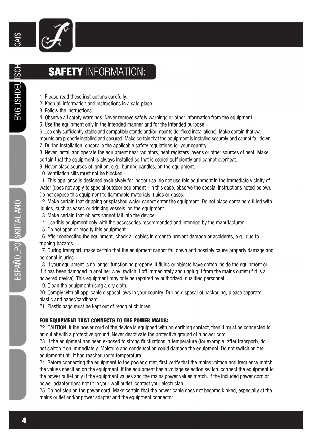 mains outlet and/or power adapter and the equipment connector. SAFETY INFORMATION:4 5 ITALIANOPOLSKIESPAÑOL FRANCAISFRANCAIS FRANCAISFRANCAIS FRANCAISDEUTSCHENGLISH